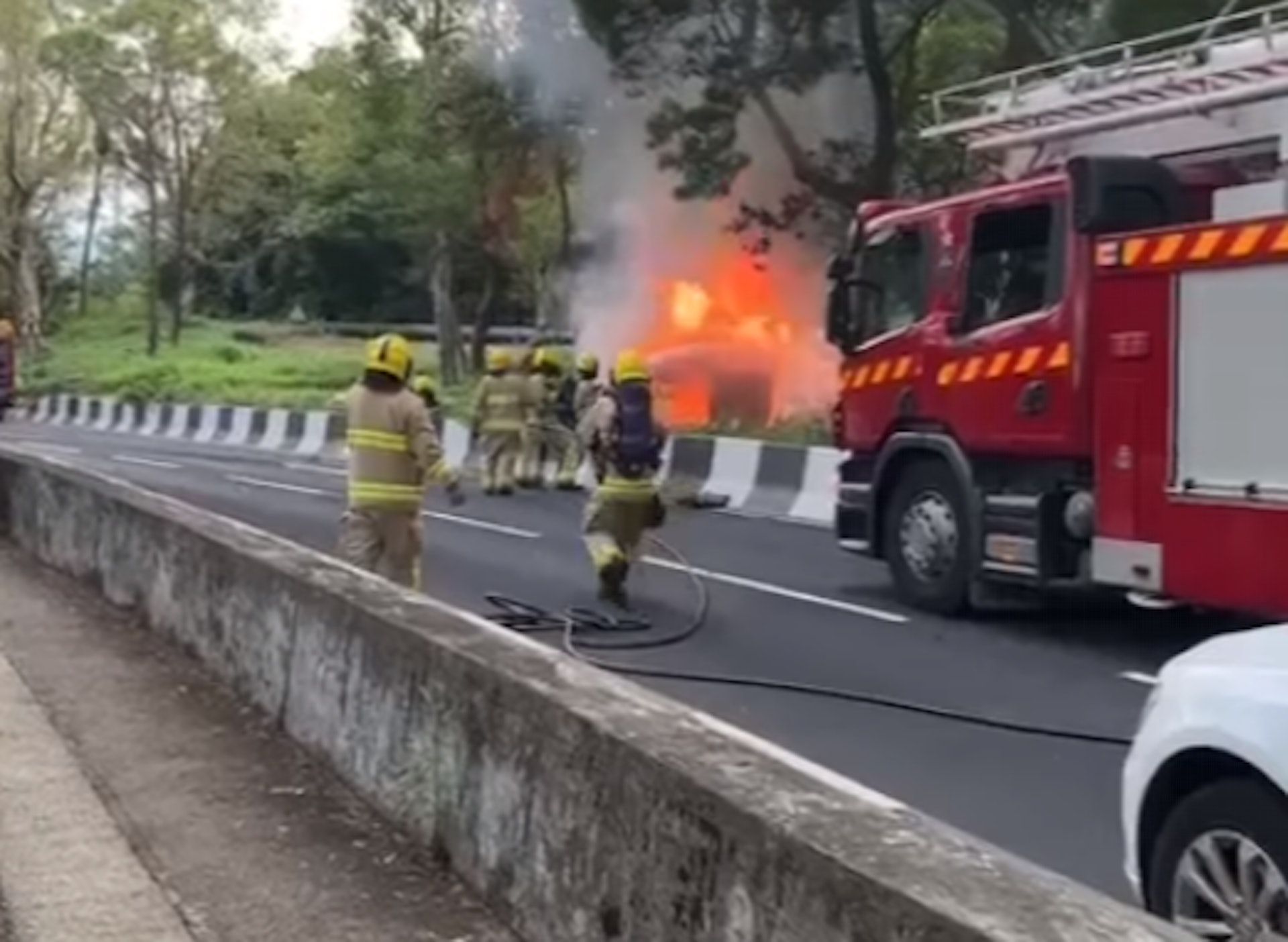 清水灣發生交通意外,有車輛起火,消防員到場撲救。(香港公共交通智庫)
