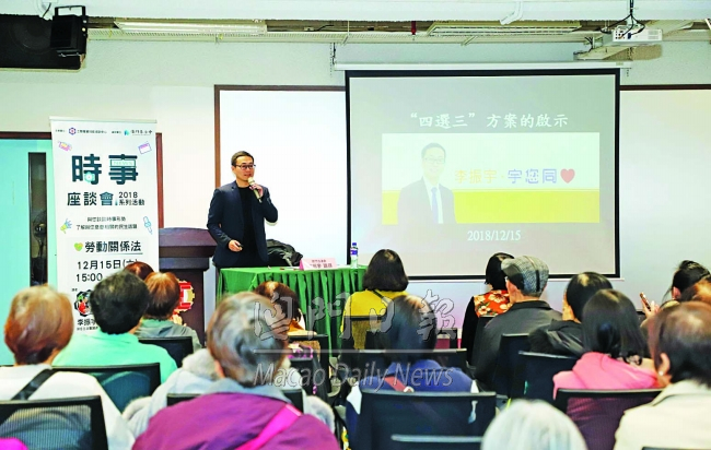 【本報消息】由工聯職業技能培訓中心主辦,澳門基金會資助的“時事座談會——勞動關係法”昨舉辦,主辦單位望藉是次活動加深參加者對《勞動關係法》及其修法方向的了解,推動職工群眾關心自身權益。主講嘉賓、立法議員李振宇呼籲政府盡快修改《勞動關係法》,對共識性強的內容,如延長產假天數,增設男士有薪侍產假及設立疊假補假須優先處理。