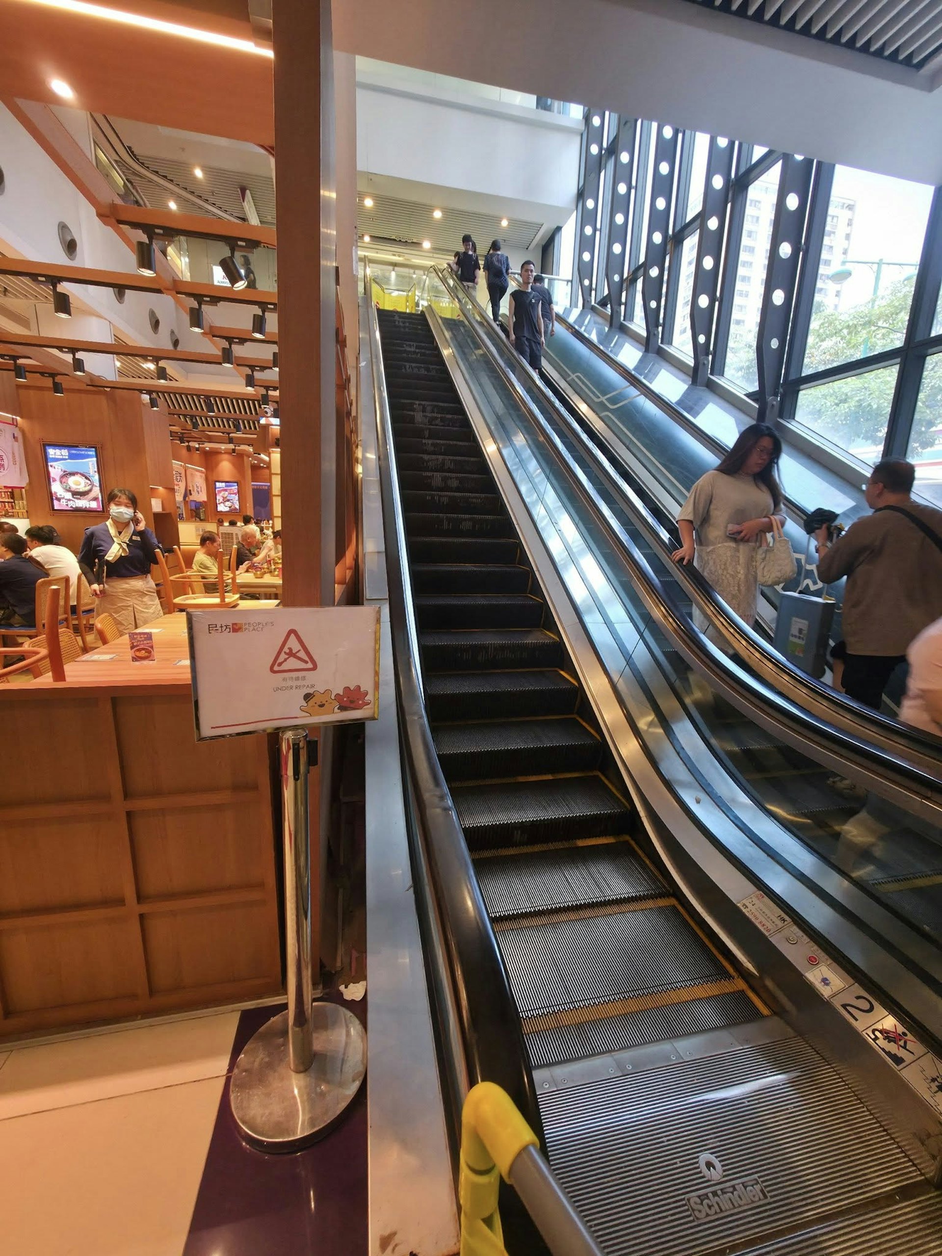 餐廳圍板被撬開,扶手梯暫停使用。(黃學潤攝)