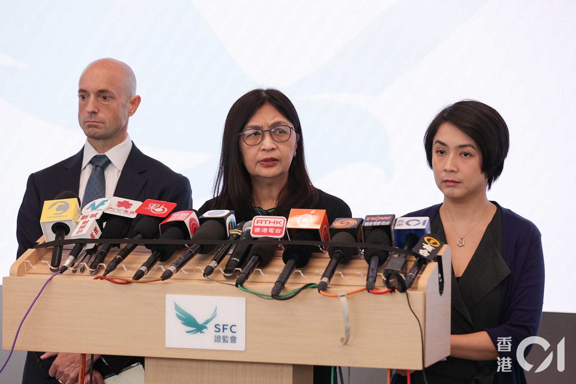 5 _ c4 |6 m p0 B9 a e2023年9月25日,證監會記者會,證監會行政總裁梁鳳儀(中)、法規執行部執行董事魏弘福(Christopher Wilson)(左)及金融科技組主管黃樂欣(右)回應JPEX事件。(蘇煒然攝)