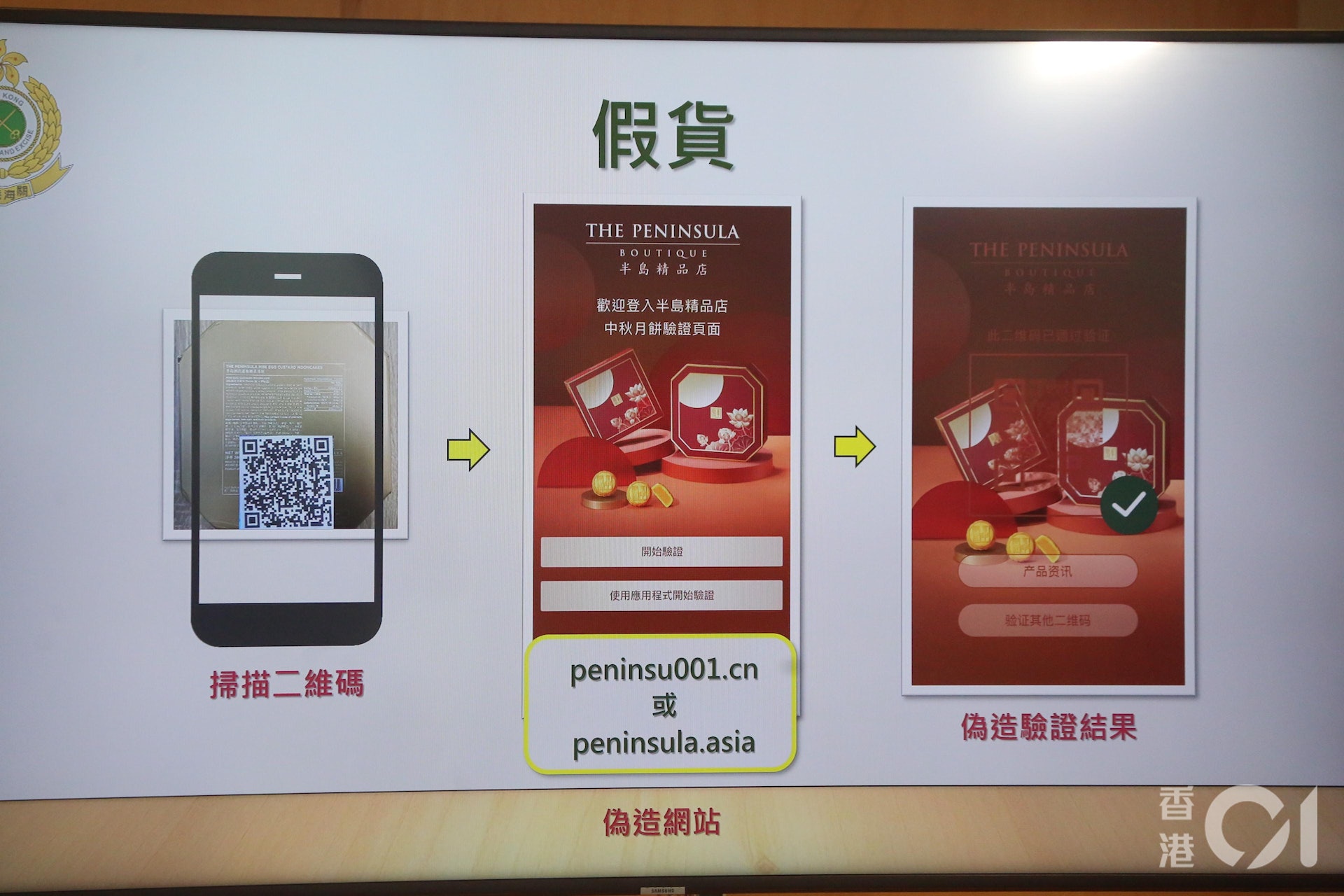 正貨包裝盒底部印有一個二維碼鐳射貼紙以驗證產品,貼紙上有一個一個編號,商標持有人指出每盒月餅都有一個獨有編號,不會重複;冒牌月餅也有二維碼鐳射貼紙但重複編號。(黃偉民攝)