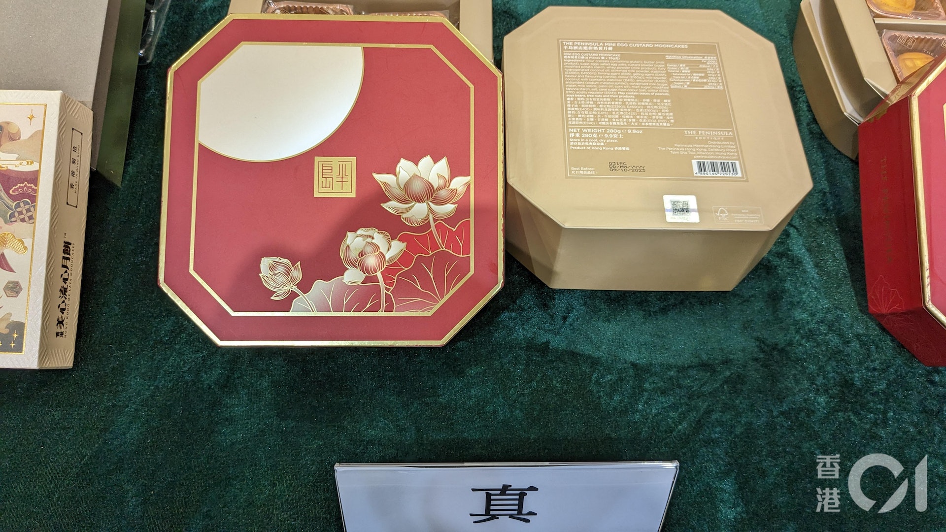 正貨包裝盒旁邊有防偽標籤,揭開標籤底層有彩色防偽碼及二維碼,經官方指定手機程式掃瞄二維碼,就可以連結到指定網站,查詢貨品真偽,並可看到首次查詢的日期時間。冒牌月餅側面有類似標籤,但揭開標籤並不能用指定程式掃瞄二維碼,無法認證真偽,而且部分標籤一揭就會損壞盒身。正貨售價284元;冒牌月餅售價200元,是正貨的七成。