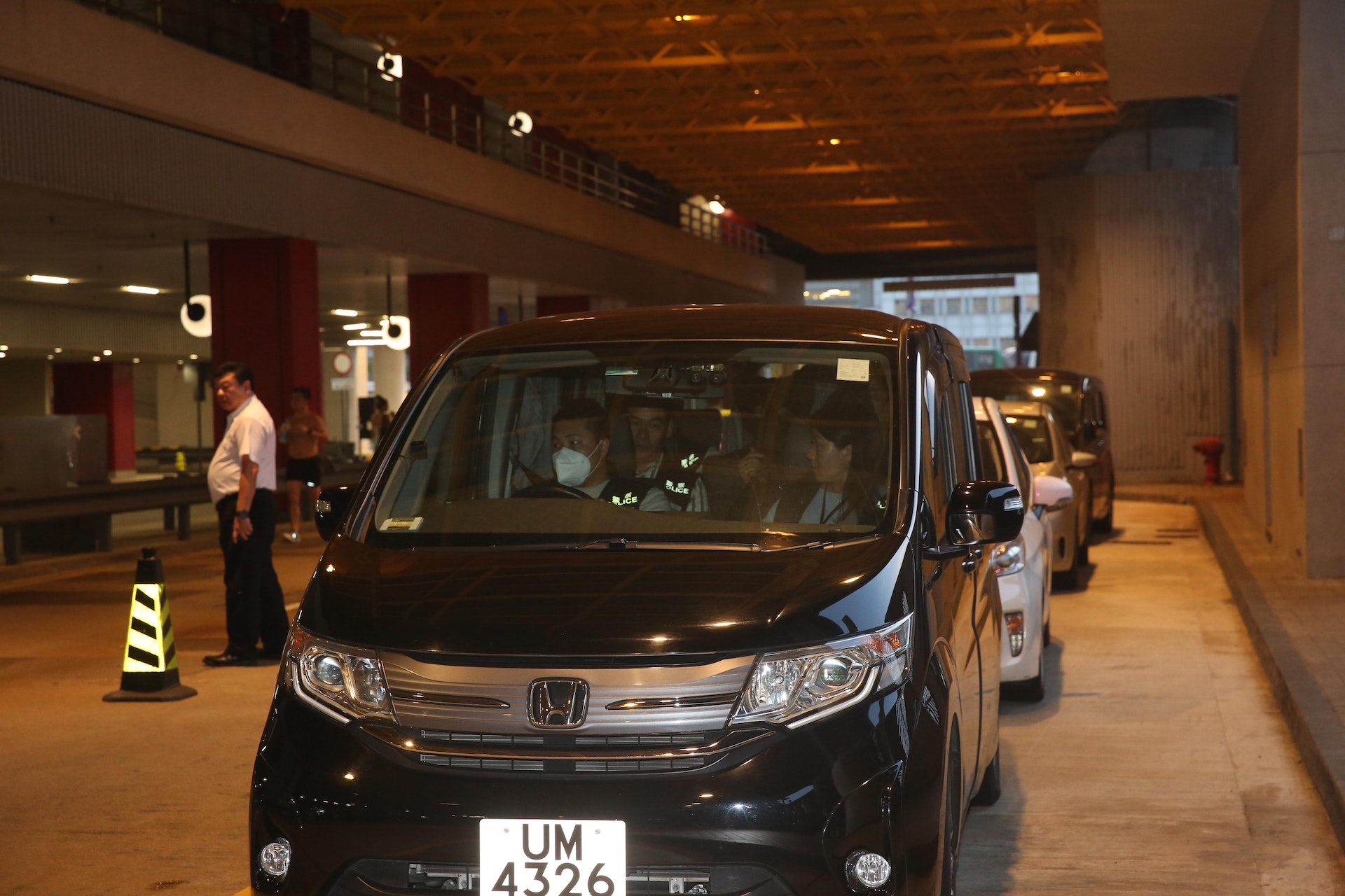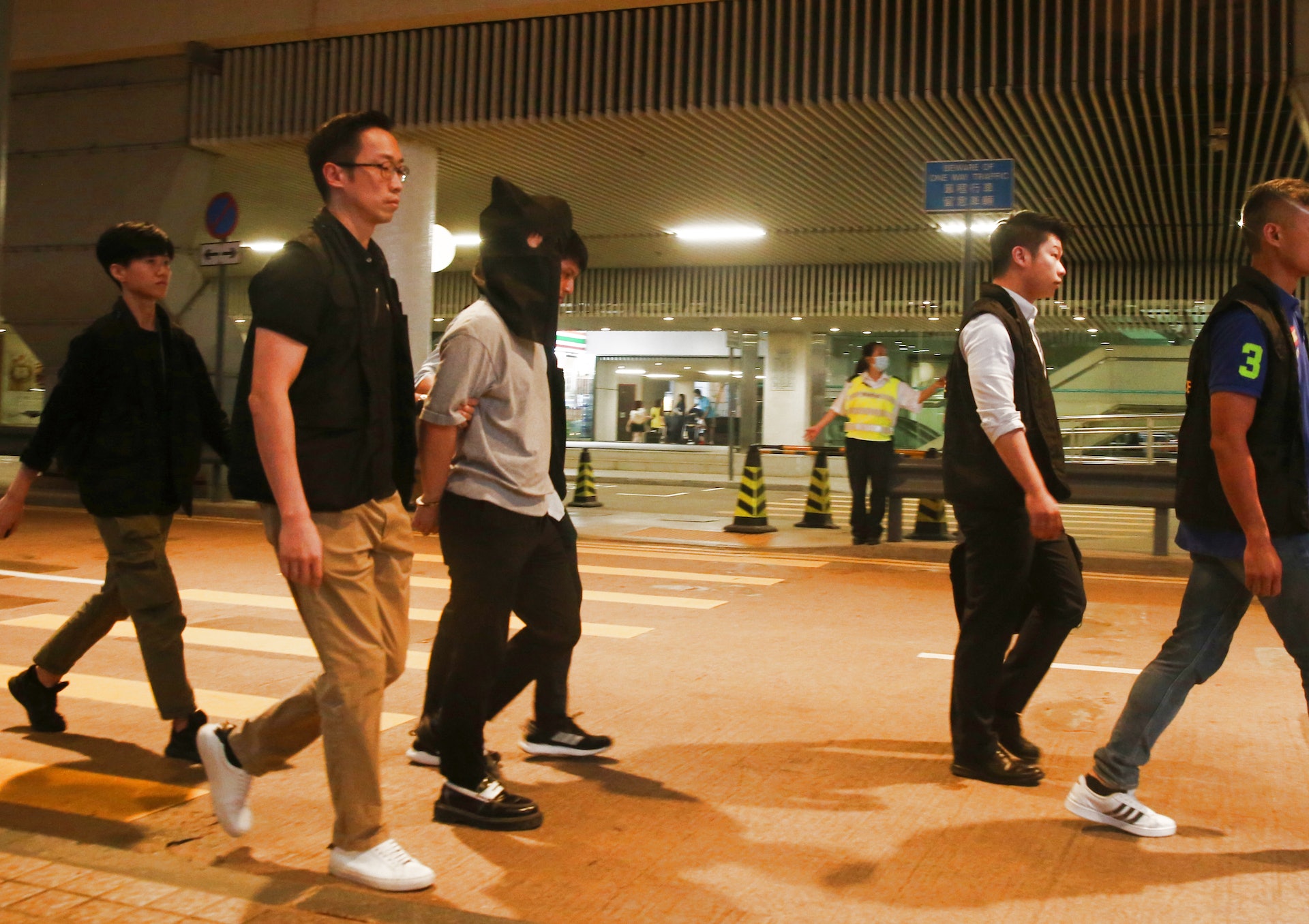 兩名在澳門被捕疑犯被押解回港後,遭香港警方拘捕。(王譯揚攝)