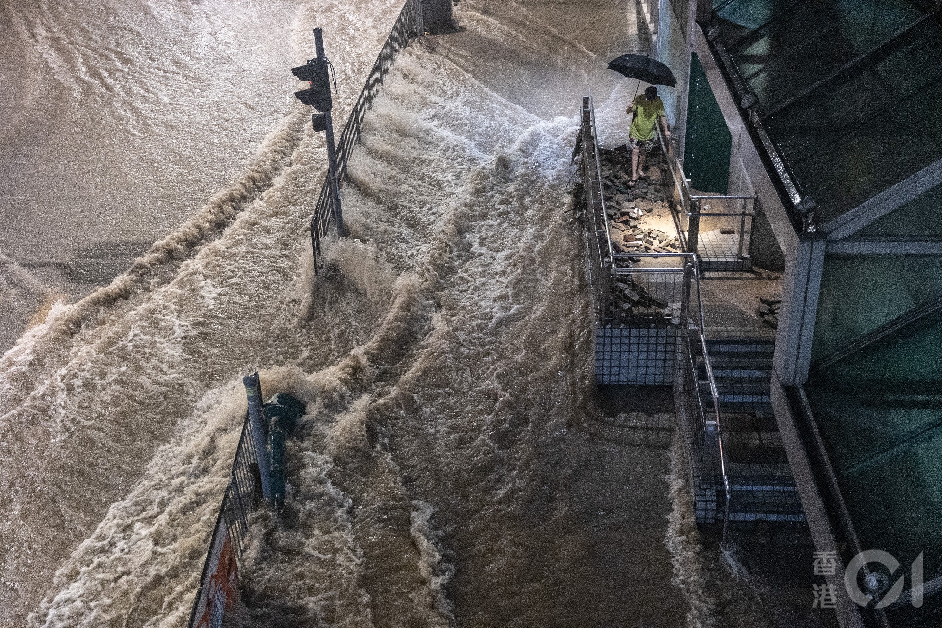 . T( X3 K, U) v7 O! T- B% H9月8日,暴雨造成嚴重水浸,市民小心翼翼穿過被雨水沖爛的通道。(廖雁雄攝)