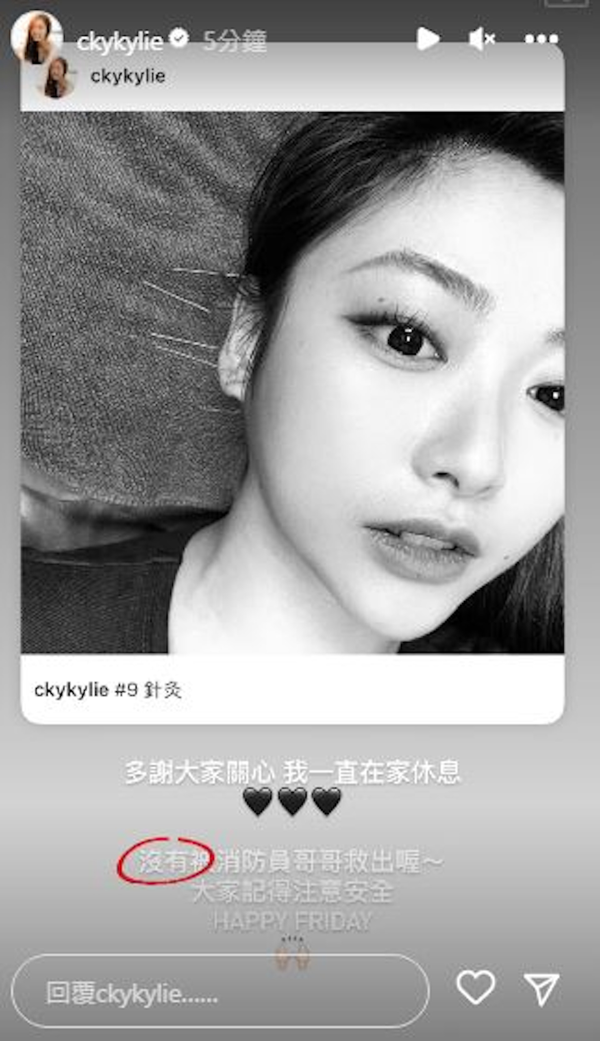 突如其來成為網民焦點,Kylie在9月8日下午2時許發IG限時動態親自回應:「多謝大家關心,我一直在家休息,沒有被消防員哥哥救喔﹗大家記得注意安全,HAPPY FRIDAY。」