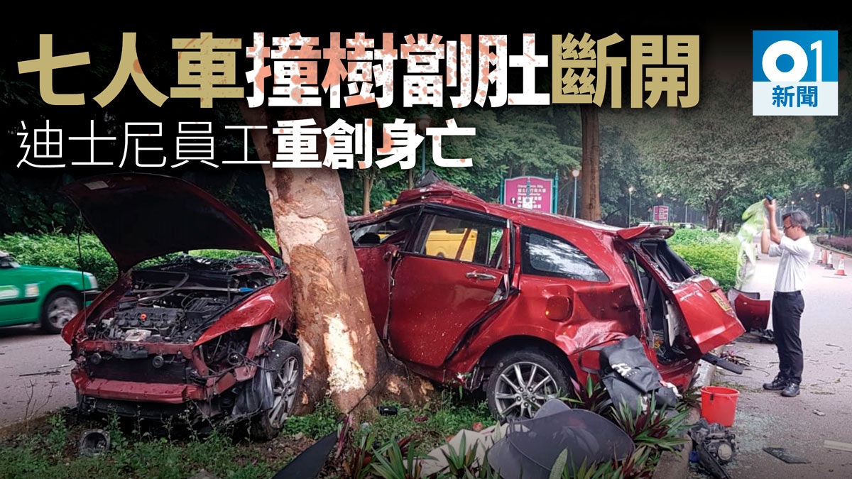 死者梁×佳(50歲)是迪士尼樂園設施服務部的維修員,昨晨7時許,黃色暴雨警告信號生效期間,梁駕駛七人車返回迪士尼樂園上班,沿神奇道南行至樂園西閘近酒店對開時,突然失控甩尾,左邊車身狂撼分隔來回行車道草坪上一棵大樹,車身當場被劏開兩截,梁頭部重創昏迷,途經駕車人士發現報警。