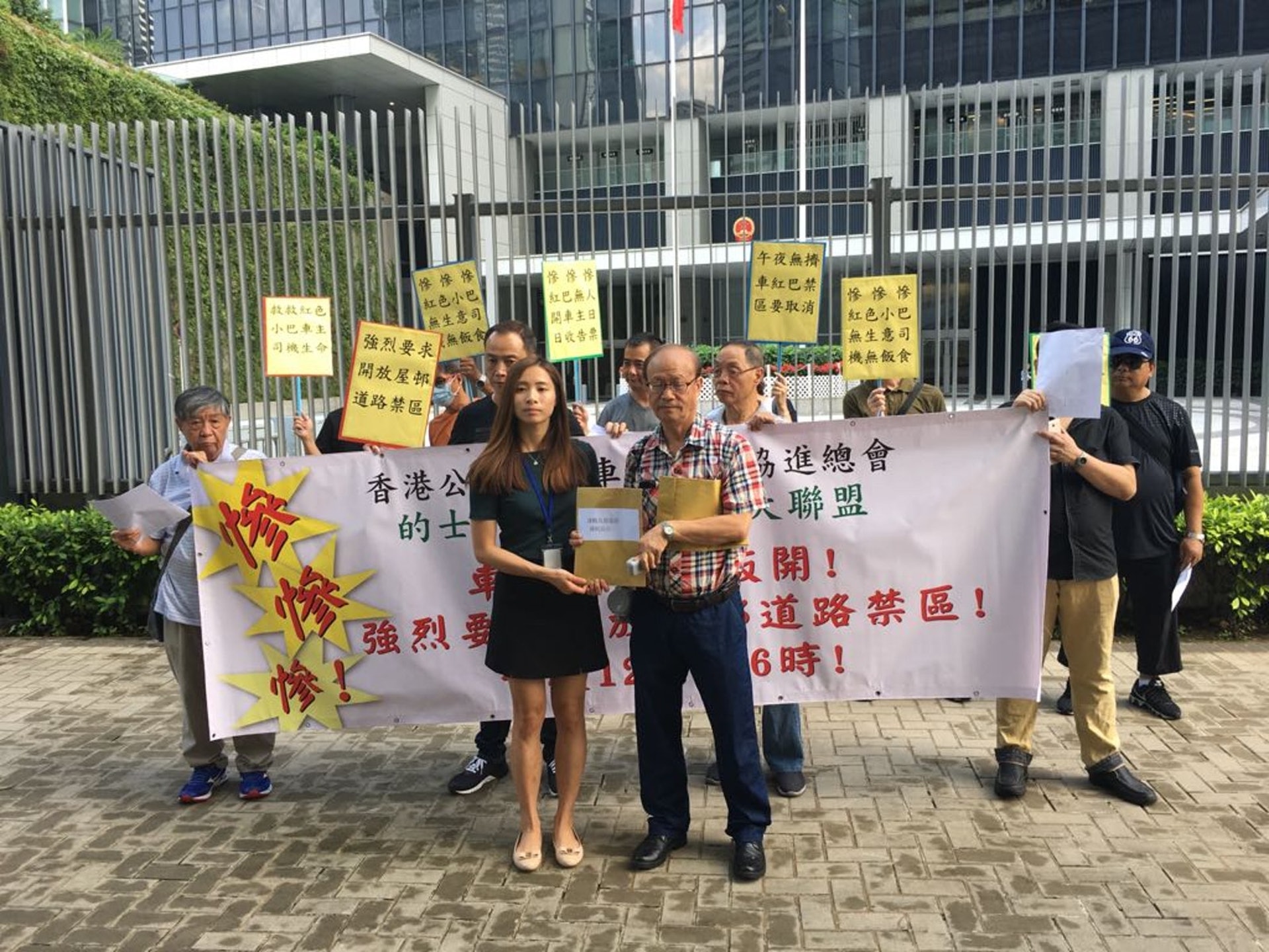 ( A: b! ^, ?0 I* `7 s, ^2 |公仔箱論壇張漢華(前排右)早前在政總外請願,要求政府在凌晨12時至早上6時全面開放禁區,以讓紅Van可以上落客。(公共小巴東主司機協進總會提供圖片) |