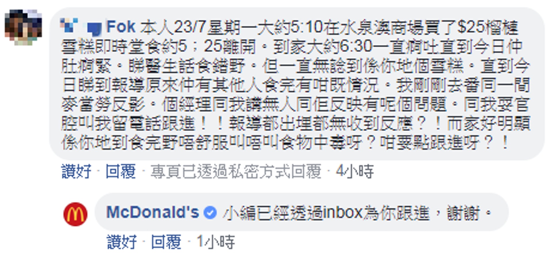 除梁小姐外,另一名霍小姐昨日(25日)下午到麥當勞社交網站上投訴,她表示在7月23日約下午5時10分在水泉澳商場買了$25榴槤雪糕即時堂食,約15分鐘後離去。她指約6時30分出現屙嘔情況,當日一直出現肚瀉及兩次嘔吐。她於昨日回到同一所麥當勞投訴,惟她指經理只表示會留意,及「清潔吓」,反而在麥當勞Facebook專頁投訴後約1至2小時,麥當勞方面已和她聯絡。 |
