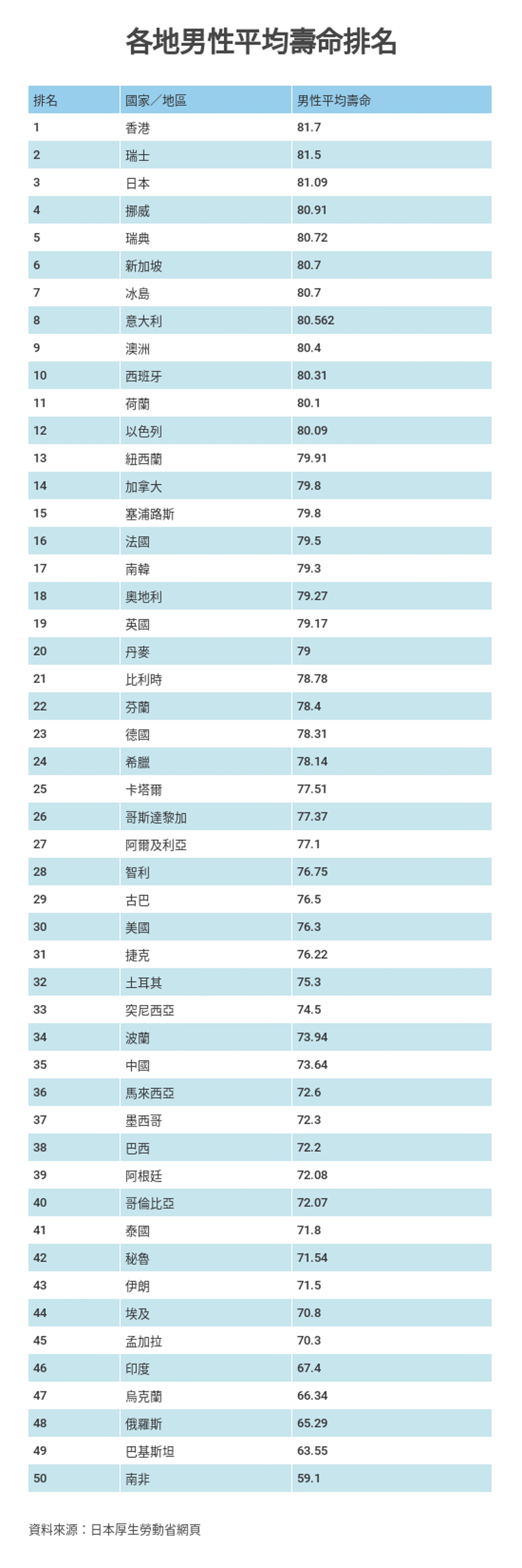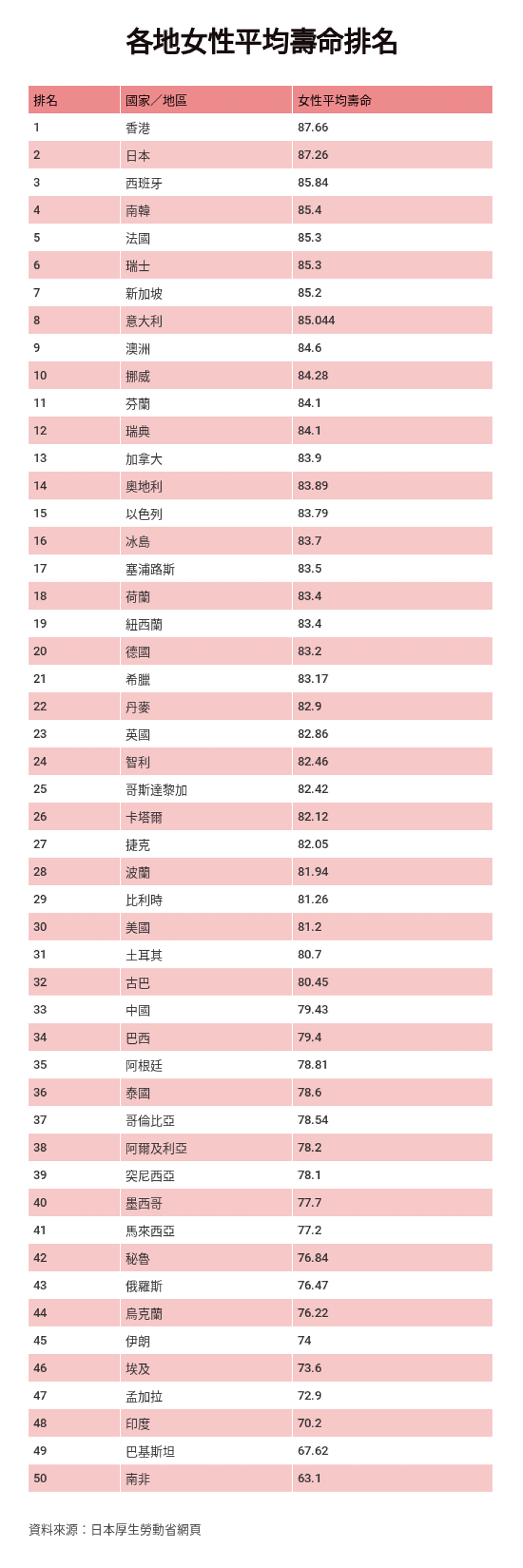 " c+ N: |: h" i1 D+ [. Z公仔箱論壇港人是全球最長壽的人,最新一項國際性調查顯示本港男女再創長壽新紀錄!日本厚生勞動省最新研究指,去年本港女性平均壽命有八十七點六六歲,男性則有八十一點七歲,是一七年度全球之冠,而港男港女的平均壽命較同一調查的去年紀錄再度延後。有本港醫生表示,雖然香港居住環境狹窄,但勝在醫療、交通,甚至與公眾健康、預防傳染病有關的排污系統都非常先進。有關注長者權益的團體則擔心,人口老化及長壽趨勢帶來基層醫療及照顧等社會問題,有長者曾訴苦「都唔知咁長命做乜」!