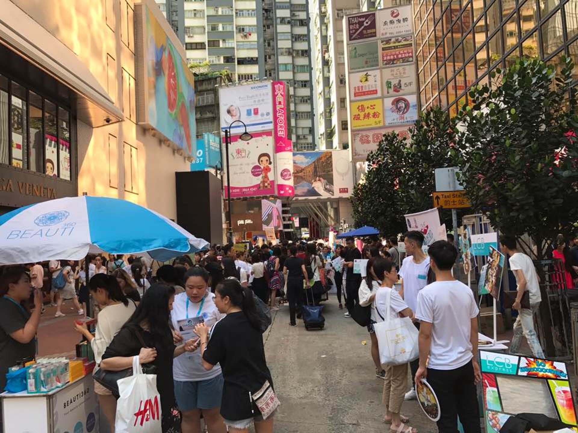 此外,崇光百貨外一段東角道行人專用區,今日則擺滿各個品牌的推廣活動檔攤,可説是「插針不入」,要前來「獻唱」有一定難度。 |