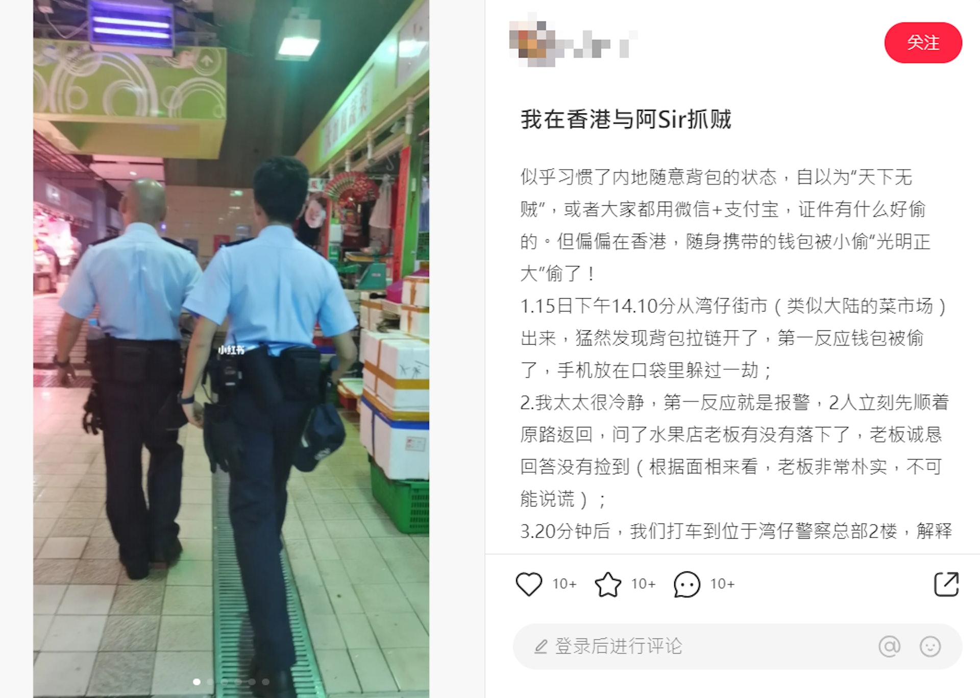 近日,一位內地男在小紅書發帖以「我在香港和與阿Sir抓賊」為題,稱他和太太一起來港旅遊,當日下午2時在灣仔街市走走逛街時,突然發現背包的拉鍊被打開,驚見錢包被偷走了。事主指:「我太太很冷靜,第一反應就是報警,二人立刻先順着原路返回。問了水果店老闆有沒有落下了,老闆誠懇回答沒有撿到。根據面相來看,老闆非常樸實不可能說謊。」隨即他們就走到灣仔警署總部求助,填了基本個人資料和遺失內容清單後,「我問總部警察大概甚麼時候有結果,警察告訴我3日左右如無通知,即無法追溯。這裡的表單寫的是遺失/失竊,沒有立案、也沒有警務人員進一步對接,直覺告訴我沒立案等於認栽(承認自己倒霉)」tvb now,tvbnow,bttvb; p+ l* l3 p, s# _( U4 p