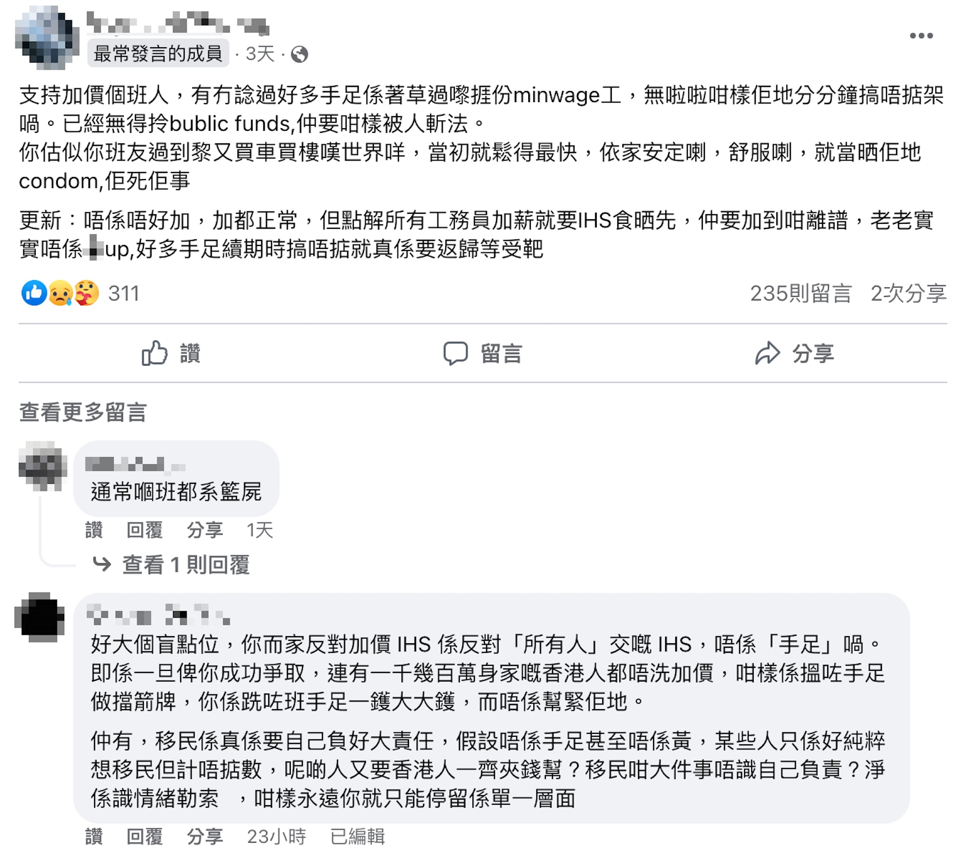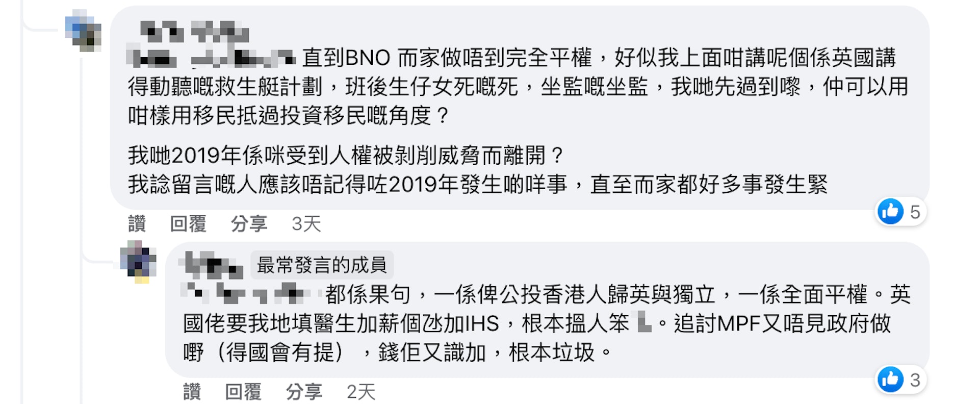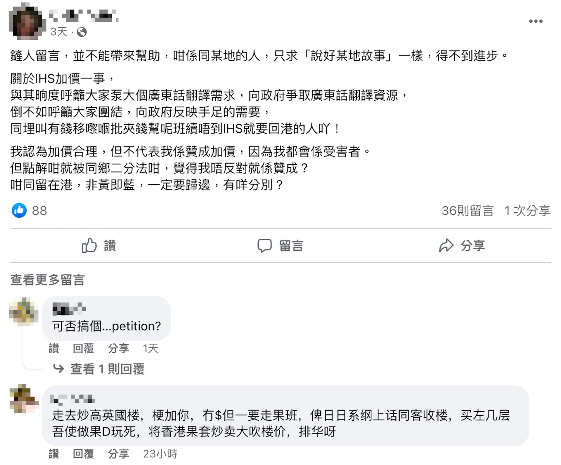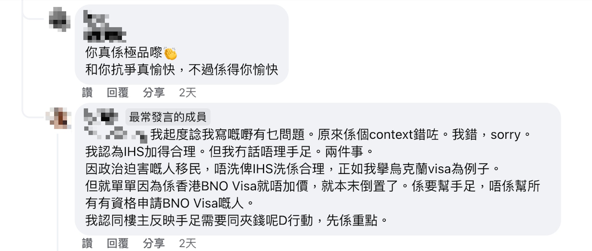 有移英港人認同移民費用加價是英國政府合理的做法:「新移民憑乜可用優惠價去享用公家急症室先?新移民又冇交過好多年稅」、「比多少少錢佢肯收容我地已經好好」、「加價一定唔開心架啦,但計埋通脹我又覺得合理。」