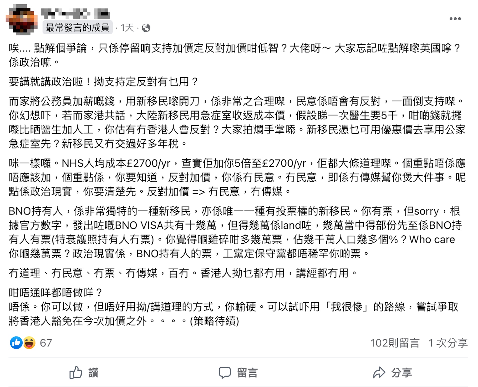 I. ]8 V8 v& d4 n* p6 jos.tvboxnow.com對此加價措施引起不少移英港人的討論,在Facebook的「曼徹斯特香港谷」群組中,有不少網民對移民費用加價有不同見解,甚至有網民發起帖子投票,發現超過7成投票人認為移民保健附加費(IHS)不應該加價。原因是網民認為部分移英港人並非有很多積蓄,亦有不少港人在失業的情況下移民到英國,認為英國政府此時此刻加價是對新移民不友善的做法。3 ^2 R W, J9 x& Q5 I