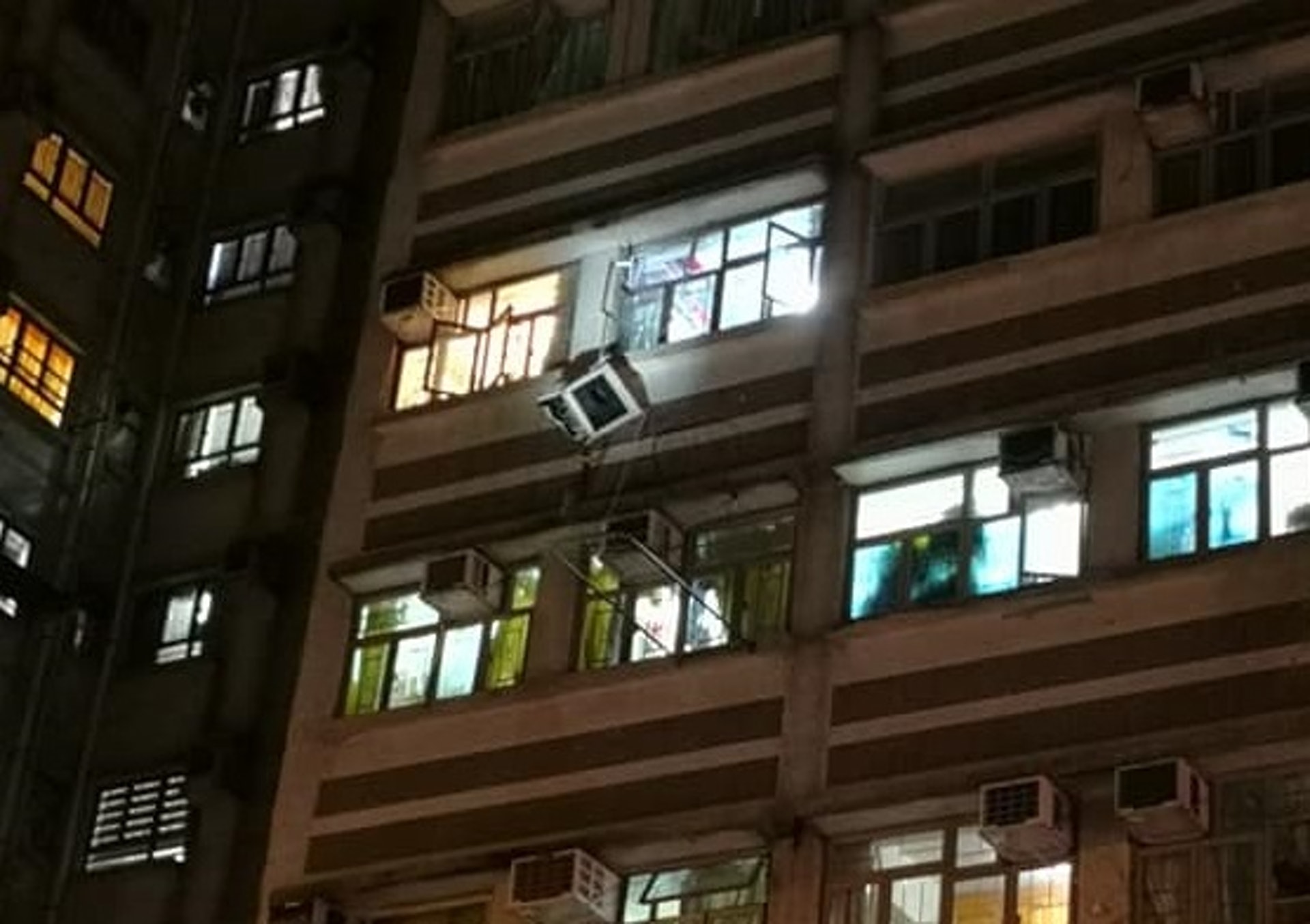 9 h+ f; t% K) t8 L( d4 Y0 _冷氣機在窗外「吊吊揈」,由消防員升起雲梯將它拆下。(Edward Chan香港突發事故報料區)公仔箱論壇. u: P ~5 y& u, C8 N