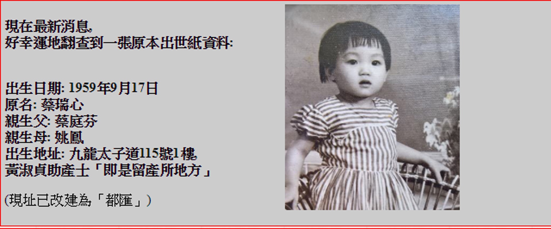 串連親友們提供的蛛絲馬跡,以及友人襄助下,她縮窄範圍,鎖定及推敲出自己本名為「蔡瑞心」,「阿哥細個試過喺櫃入面,見過有張出生紙係有個姓蔡嘅名」,養母多年前曾提及「瑞心」一名,「佢嗰陣話係『龍母娘娘』賜名」,訪問當天,她正好成功取得由生死登記處申請稽查所得的出世紙,接過一刻,思緒翻騰。% V3 v5 y% v. k2 e, b- v% w9 z