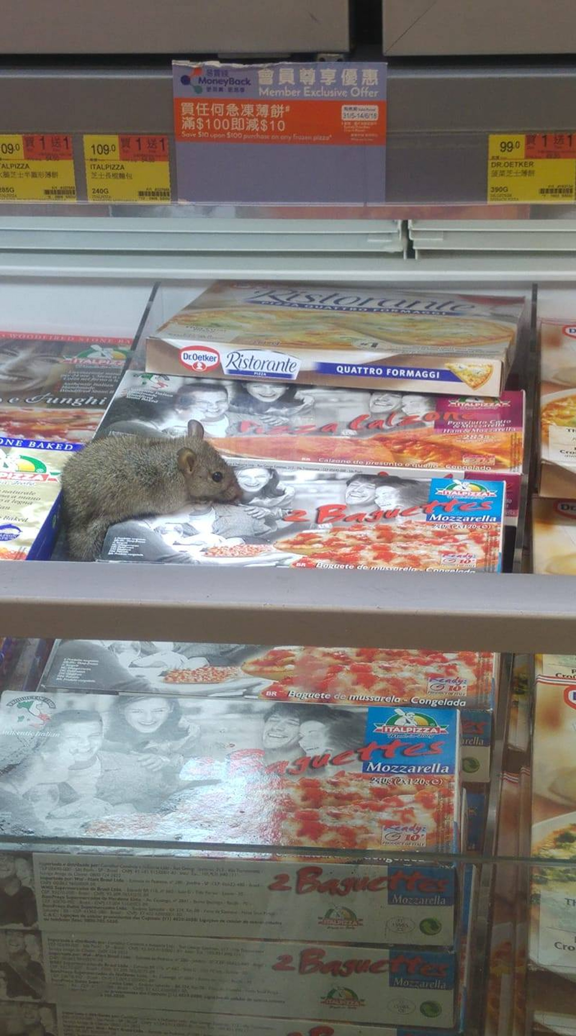 社交網站Facebook專頁「將軍澳+西貢友」今日晚上8時許發貼文,指有人在將軍澳新都城中心百佳超市內,拍攝到一隻老鼠趴在店舖一個放置冷藏產品的雪櫃內的薄餅盒上,報料網民更笑稱:「大熱天涼吓冷氣先。」
