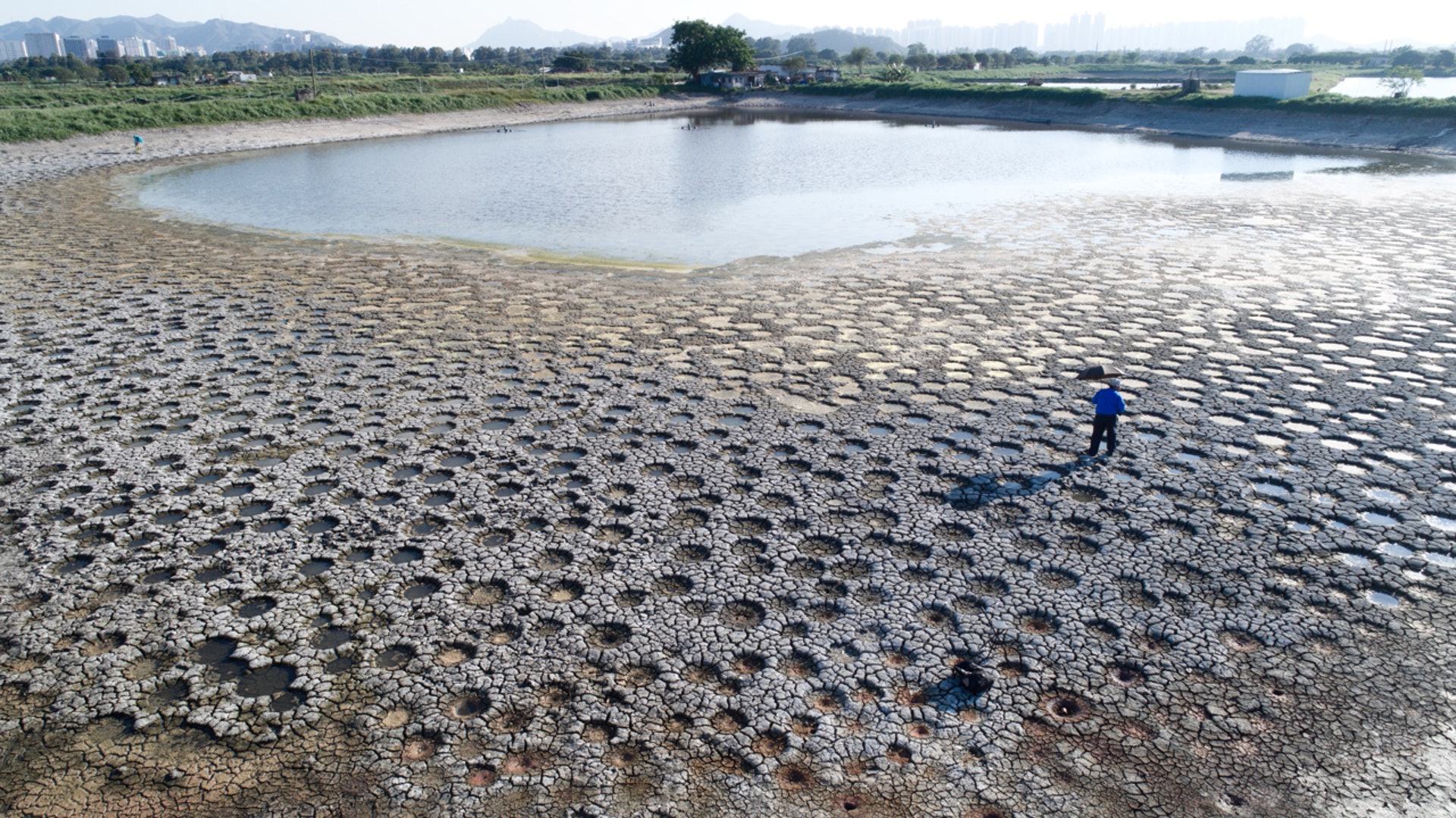 不少攝影愛好者近日紛紛湧至大生圍一個魚塘拍攝「圓洞旱照」。從照片可見,魚塘乾至龜裂,中間出現一個個大小不一的圓坑。攝影師Edward Tin亦拍得此景,他形容大生圍魚塘乾枯,形成一個個洞,頗有「異星感」:「在仍有水份下有一片片金黃色的水藻,產生一種異星感,完全乾枯的則呈現龜裂紋理,表面如鍍了一層薄薄的霜。」更有網民形容情況是「熱到星球都爆開 」。