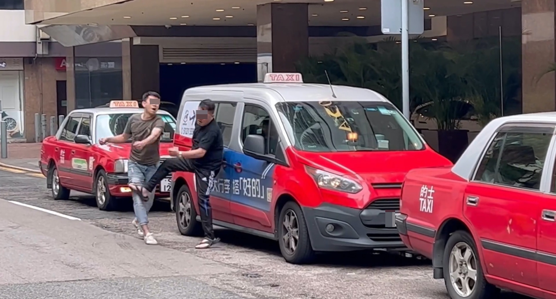 兩人各自返回的士,但黑衣人登上最前方的士,反而啡衣人登上中間該輛的士,影片便結束。(facebook群組「香港突發事故報料區」影片截圖)tvb now,tvbnow,bttvb4 s5 I4 T2 S4 Y, E5 S
