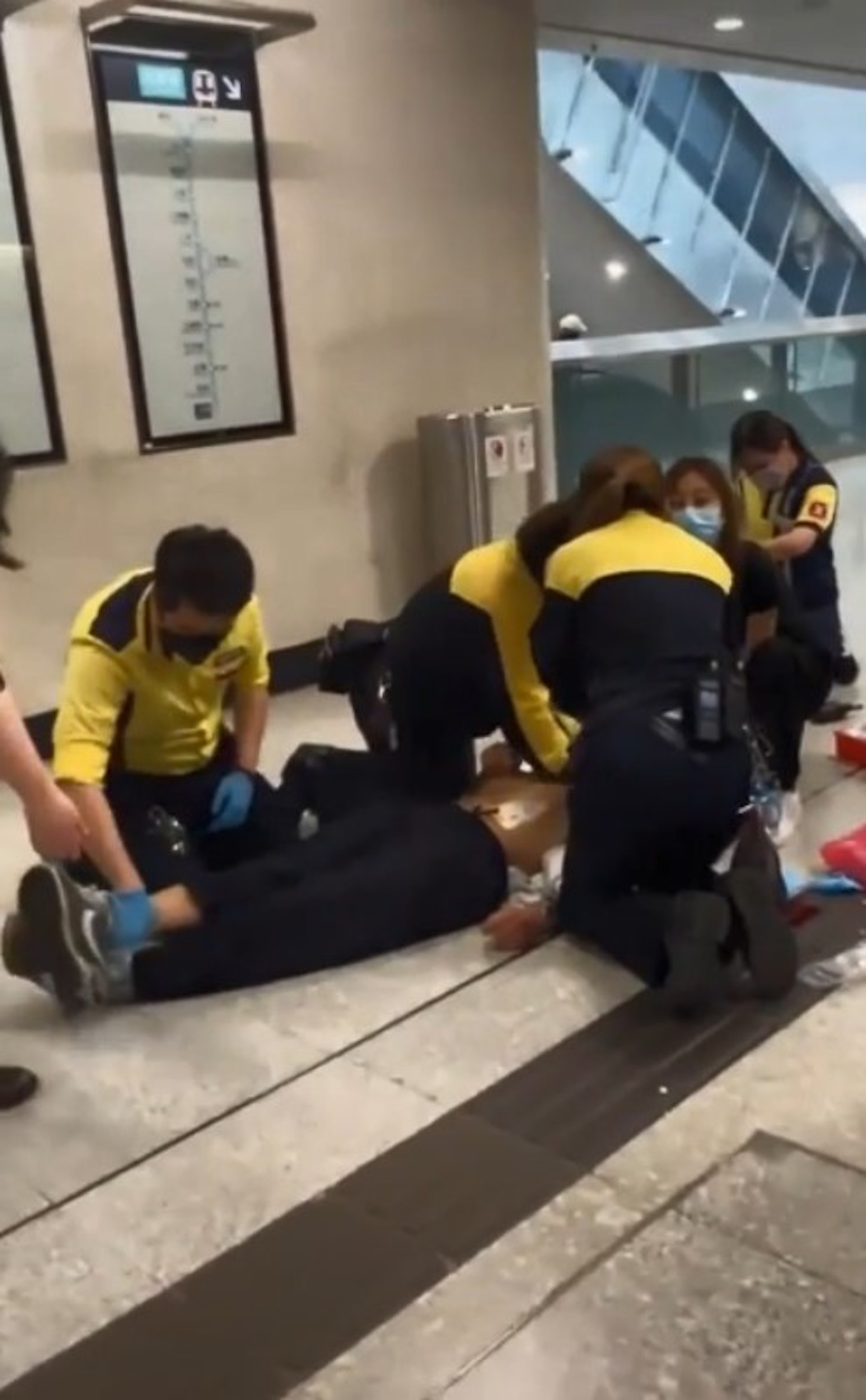 1 W5 R' `, D0 E% Q$ i! A公仔箱論壇熱心女子與港鐵職員輪流為事主進行心外壓。(網上片段截圖) |