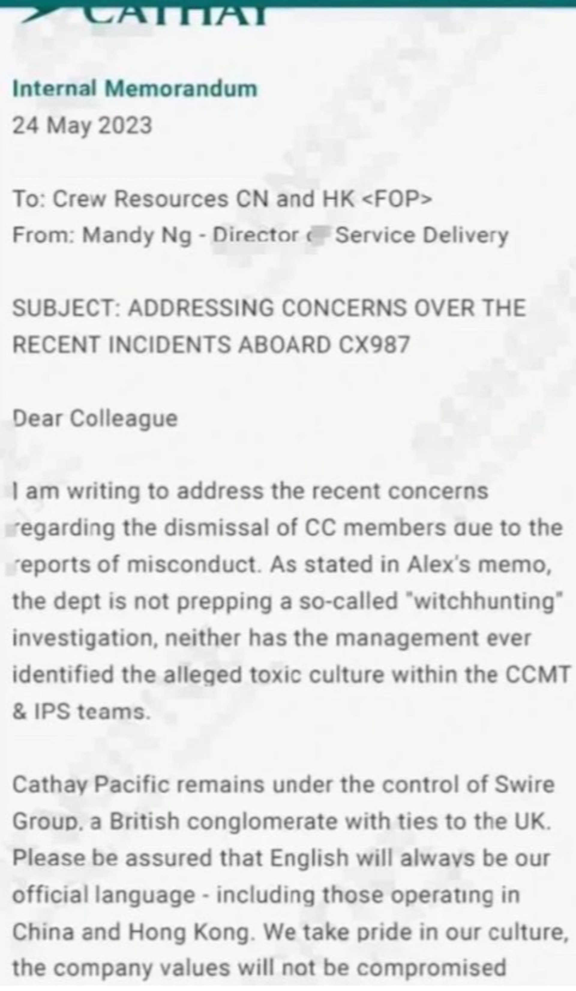 網上流傳一封聲稱是國泰航空服務董事吳潔文向員工發出、以英文撰寫的內部通告,表明公司並無準備任何「獵巫」(witchhunting)調查,又指國泰航空是太古集團一員,集團與英國有緊密聯繫,並向員工保證英文是公司營運的官方語言。# D# O9 L% C+ N; G' Z$ f9 M4 Z