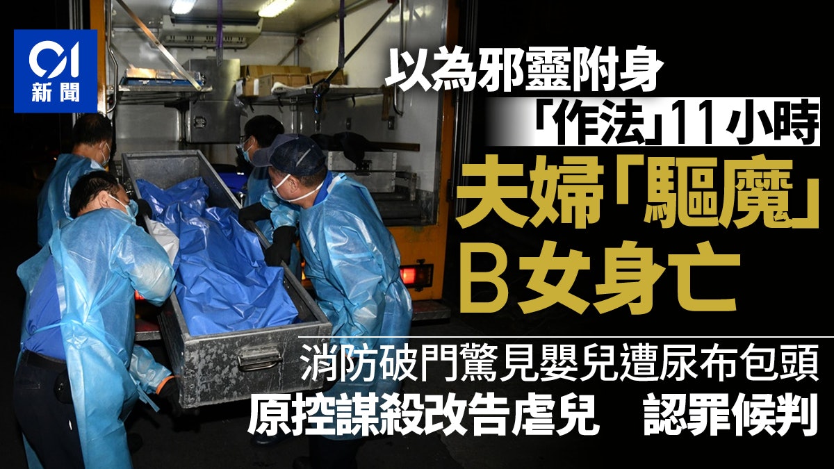 信奉基督教靈恩派的夫婦,帶14個月大女兒往探外婆後,一家三口失聯。消防員接報到夫婦家破門,發現女嬰頭部被尿布包裹死亡。女嬰母被捕後稱,兩夫婦回家後以為邪靈附體,原想為自己驅魔,期間又以為女兒亦有邪靈上身,故為女兒作了長達11小時的驅魔儀式,之後發現女兒沒有反應,強調只想為女兒驅鬼及令她復活。兩夫婦原被控謀殺,控方後改控虐兒罪,兩人今(27日)在粉嶺法院再提訊時認罪。裁判官把案押後至5月11日判刑,期間索取兩被告的背景及感化報告,另為還押的男被告索取精神科報告,女被告則准保釋。
