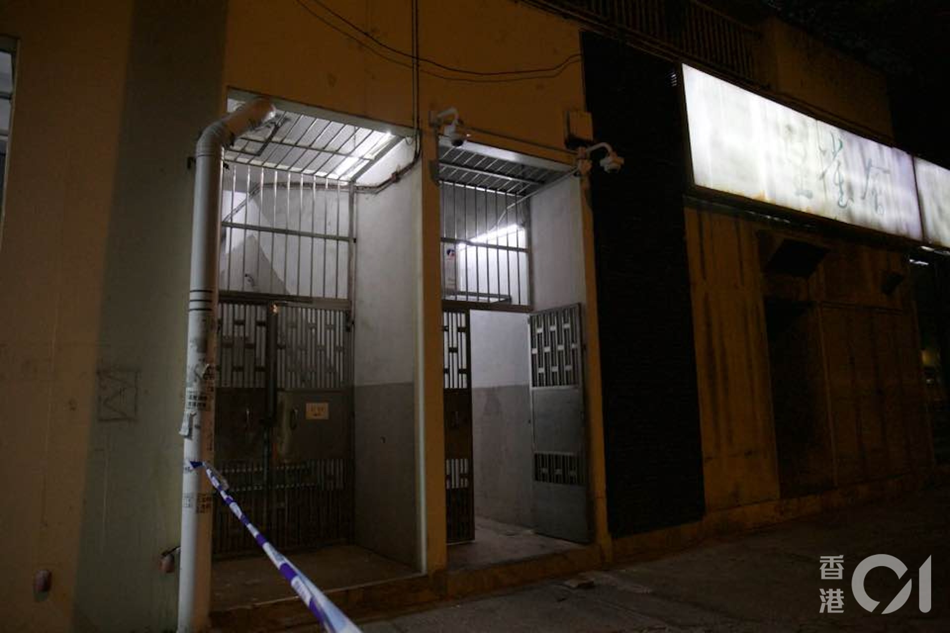 . N" S' y1 |. P公仔箱論壇案發當晚,大廈地下拉起封鎖線。(左朗星攝) |