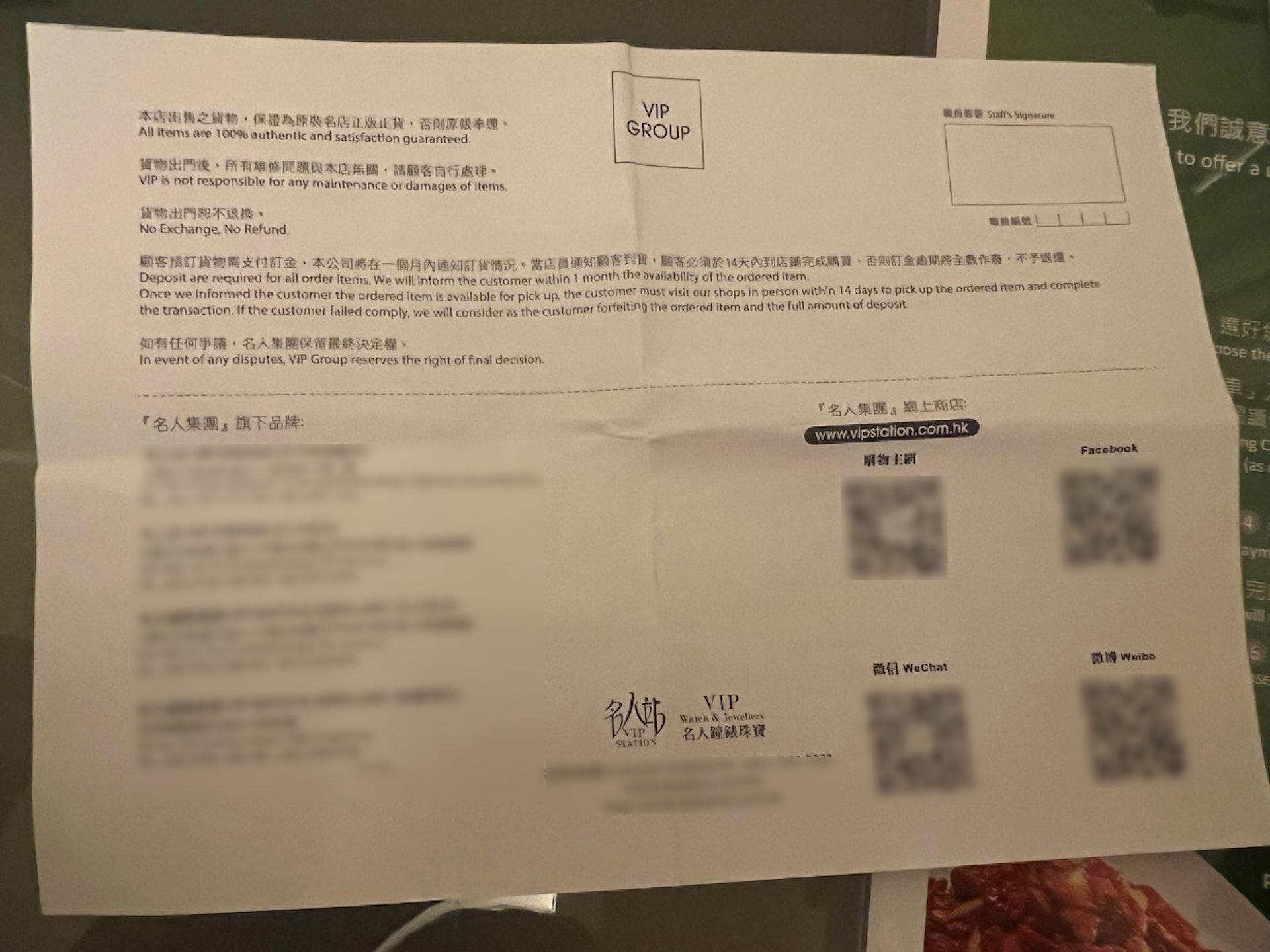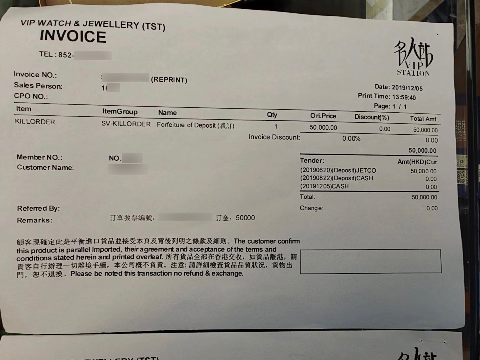 - s$ U& z9 d/ ?( I1 \購買限量名貴貨品需要落訂的情況十分常見,惟顧客必需留意購物條款。《香港01》接獲台灣來港的旅客陳先生投訴,稱於尖沙咀鐘錶珠寶名店「名人站VIPSTATION」(下稱「名人站」)訂購兩隻手錶,從2018年至2020年間先後繳付31萬元訂金,惟因疫情嚴重及封關等緣故無法到香港付清尾數。陳先生於本周日(3月26日)到香港欲「找尾數」買錶,店方指條款列明一個月內會通知顧客訂貨情況,到貨後顧客需14天內到店舖完成交易,由於陳先生沒找尾數,故店方於2020年12月將31萬元「殺訂」。陳先生質疑事件不合理,遂報警求助,惟警員指事件是糾紛而未能協助。