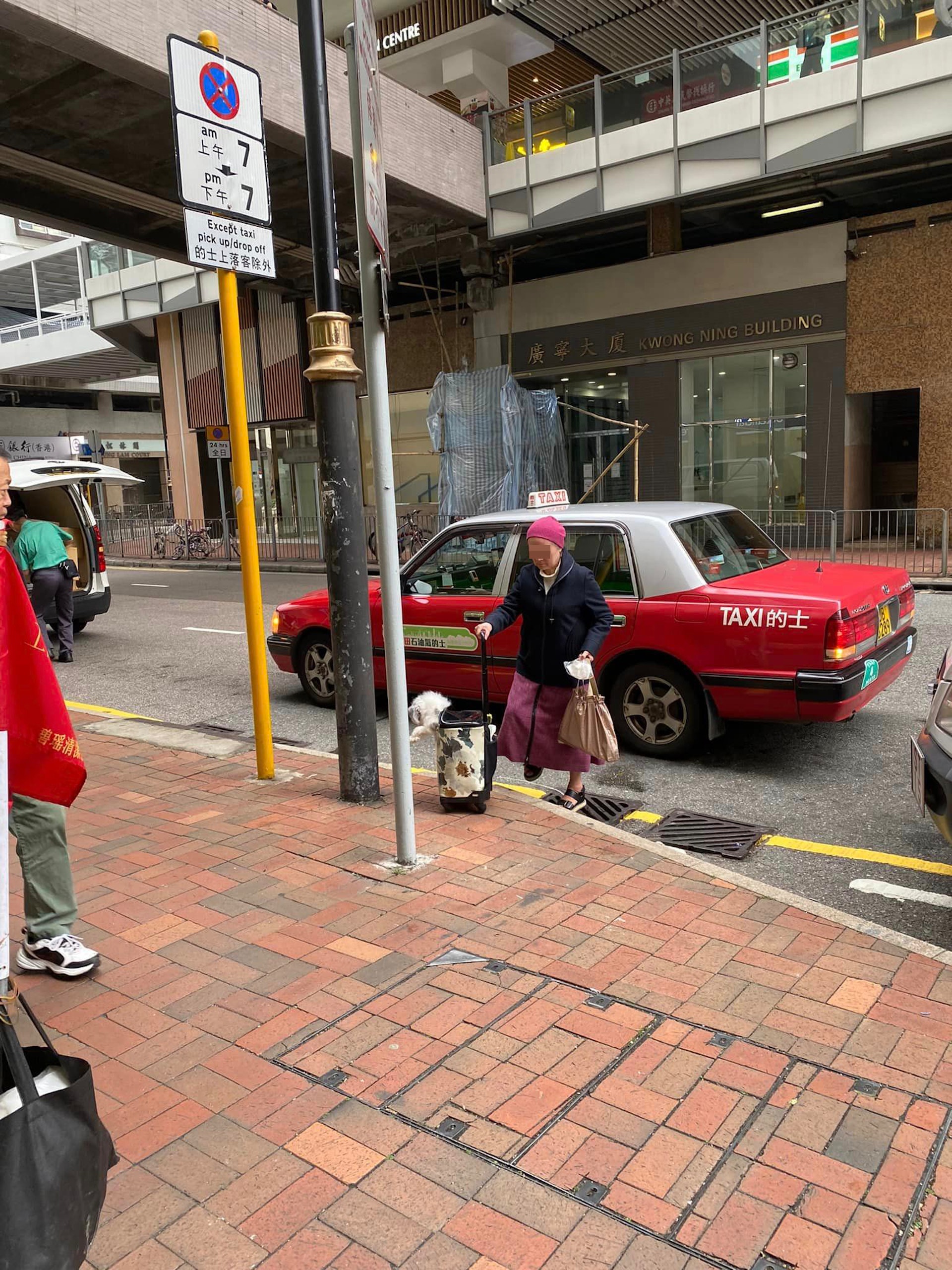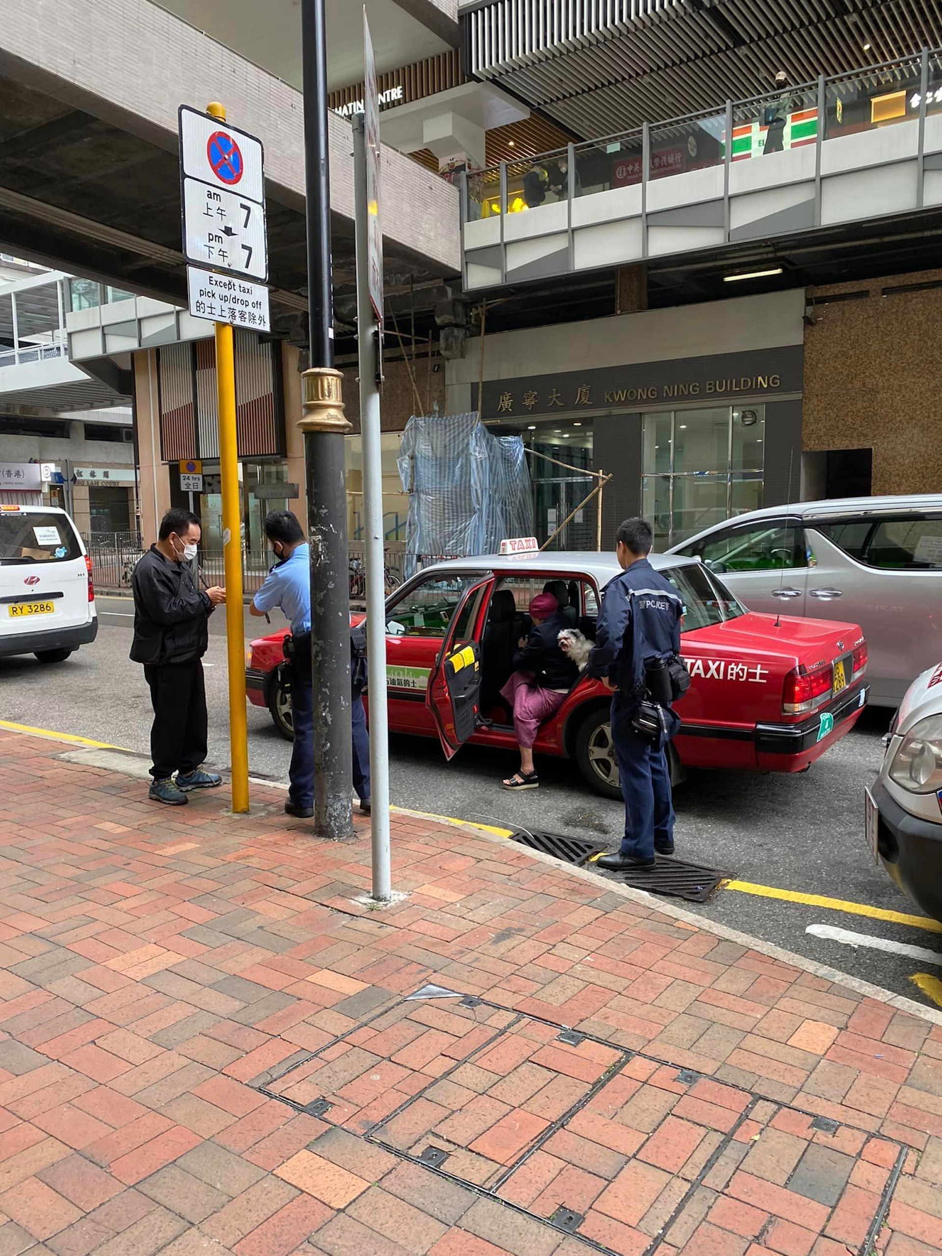 相中老婦在沙田橫壆街2號廣寧大廈對開離開的士車廂,並且手持手推車,在場則有兩名警員,上載者表示現場有人形容老婦「已幾次坐霸王車㗎喇」,但對方態度囂張。。(Chi Keung Tang/facebook群組「沙田之友」圖片)