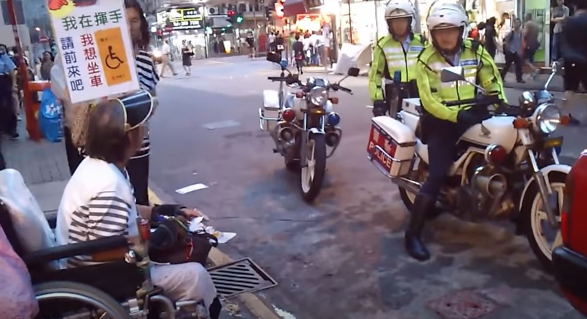 2 H4 S' n! E, F6 H6 D* e+ P5 Btvb now,tvbnow,bttvb「安蔭婆婆」離開的士車廂坐上輪椅,其輪椅上插上一個寫有「我在揮手」、「請前來吧」和「我想坐車」的字句,而且印有一個輪椅人士圖案,字牌背後寫上「我好肚餓」。(網上影片截圖)公仔箱論壇9 h# X) y+ p4 `, }& N. i- N