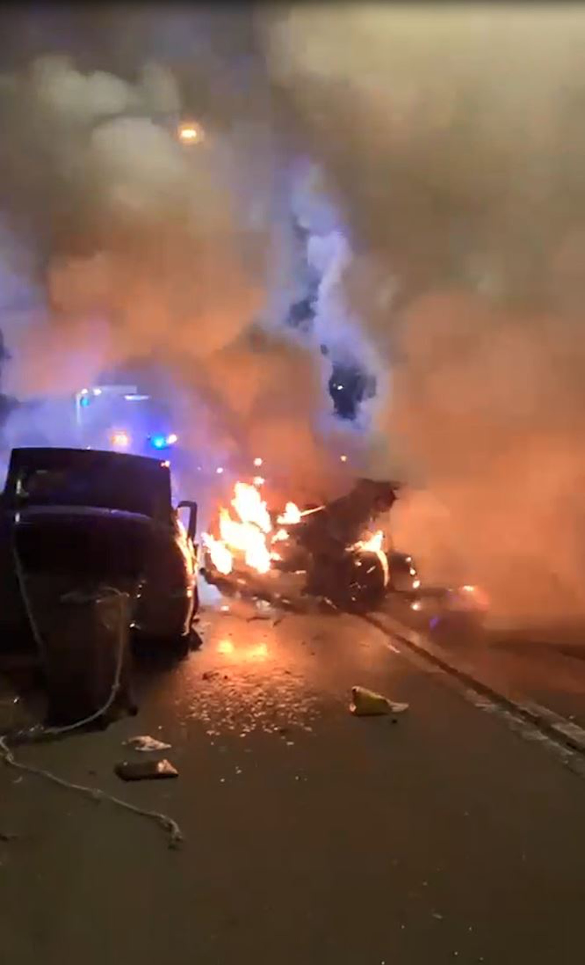 8 [( x1 E* N8 X7 {2 v! d, pos.tvboxnow.com車禍後有私家車陷入火海。(網上影片截圖)公仔箱論壇' }7 |- J$ C/ {: i1 Y5 o2 f& E3 k