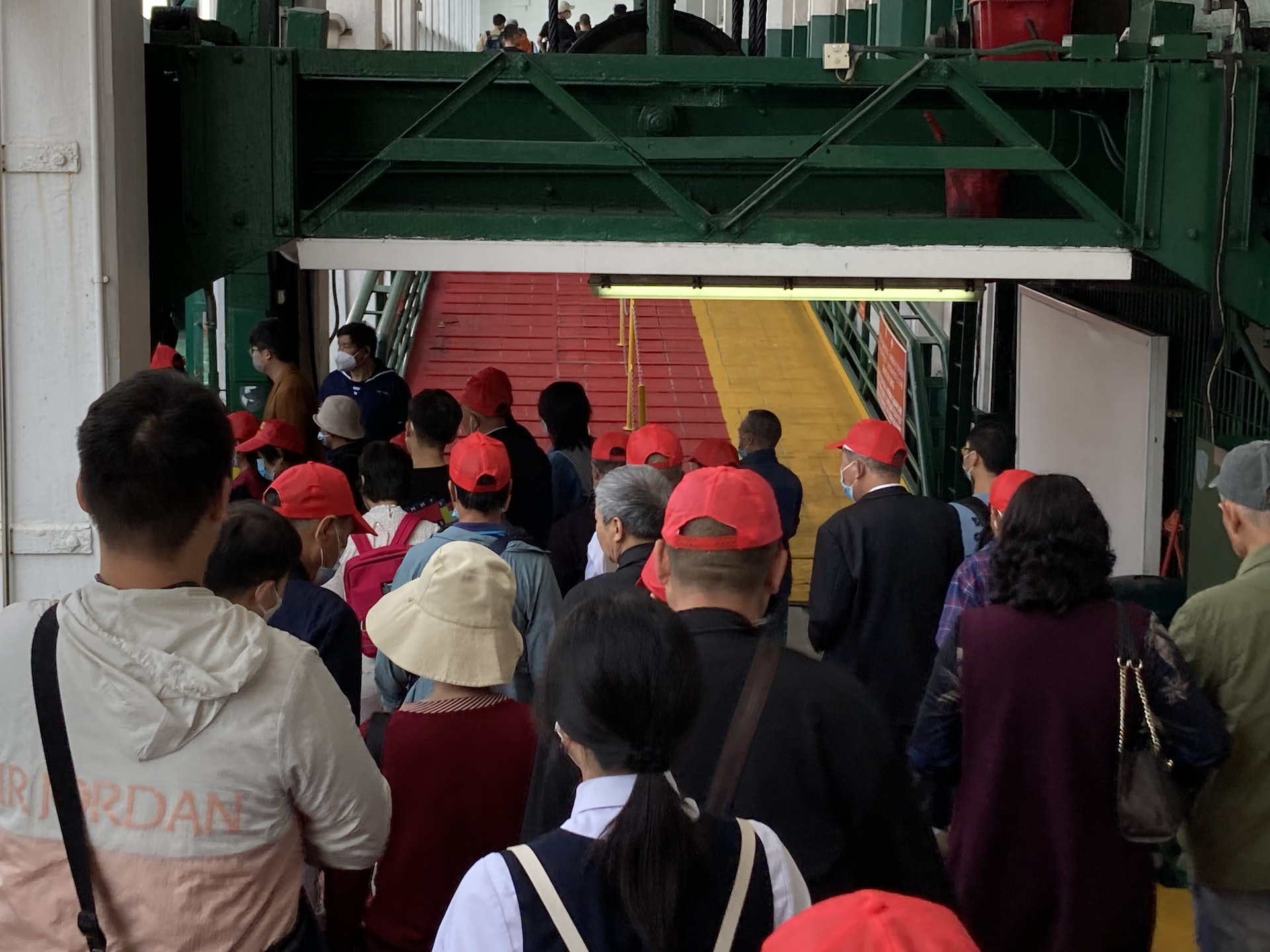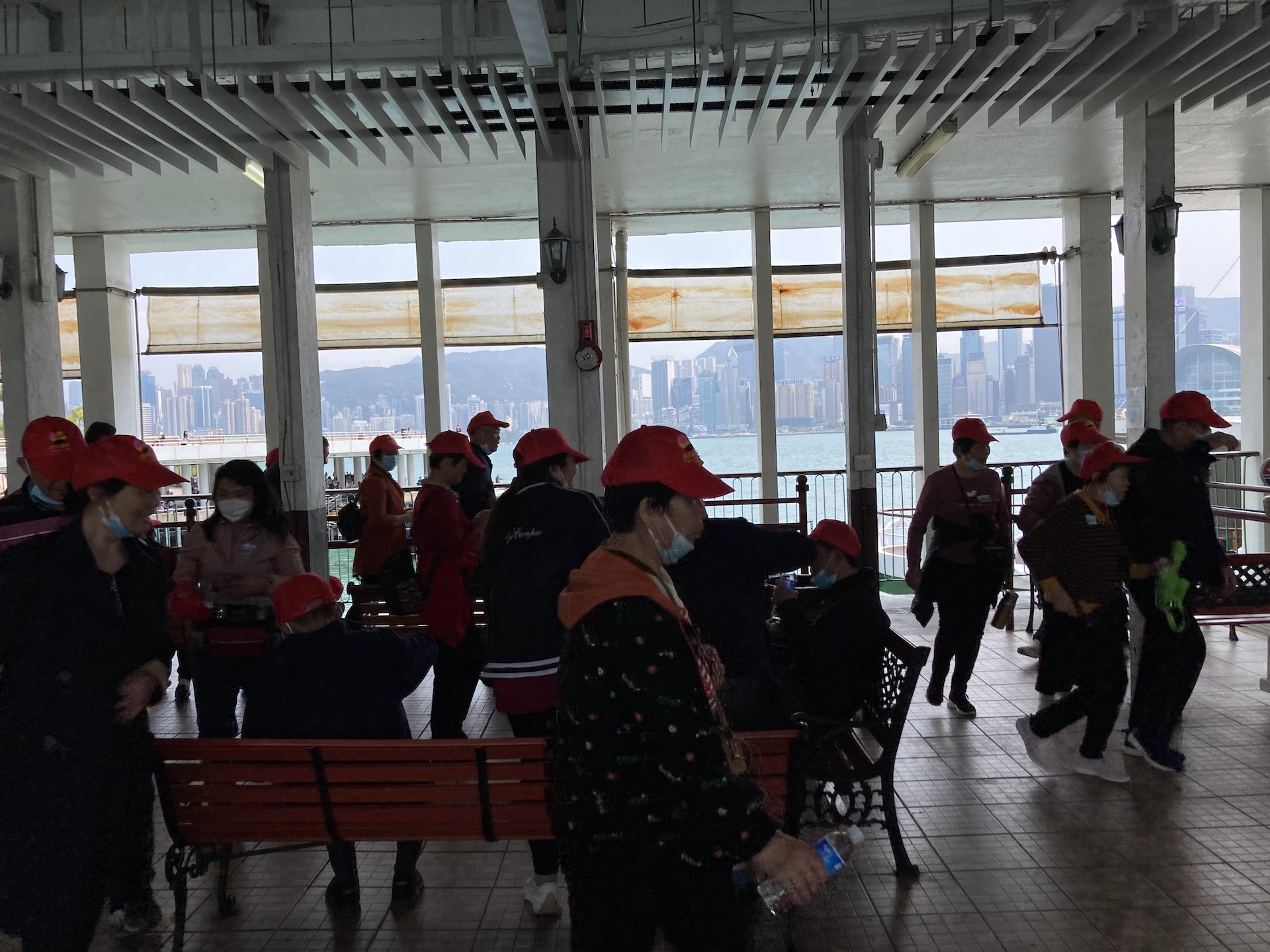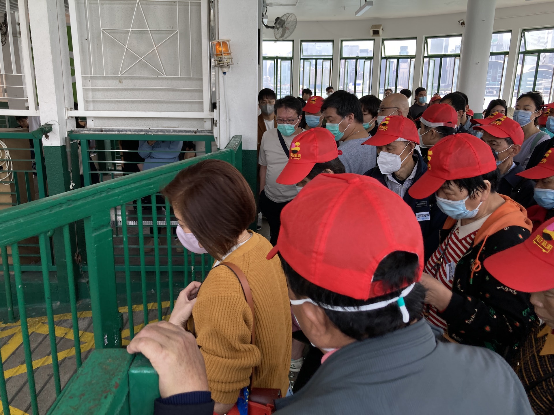 其間,團友很守秩序,入閘後先問導遊「可不可以坐?」,才坐在公眾等候區的一排排座位上,有些則站近窗邊望向維港,期盼即將開始的小輪體驗之旅。當小輪泊岸後,鐘聲一響,鐵閘緩緩打開,一班團友便興奮地前往登船,並選了窗邊位坐下欣賞維港景色,一邊舉起手機拍下眼前美景,狀甚陶醉。而一眾「小紅帽」團友混入在香港市民之中,體驗到一般港人的生活,也未有打擾其他乘客,場面有趣。