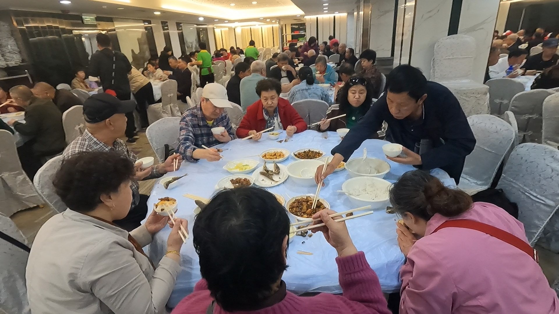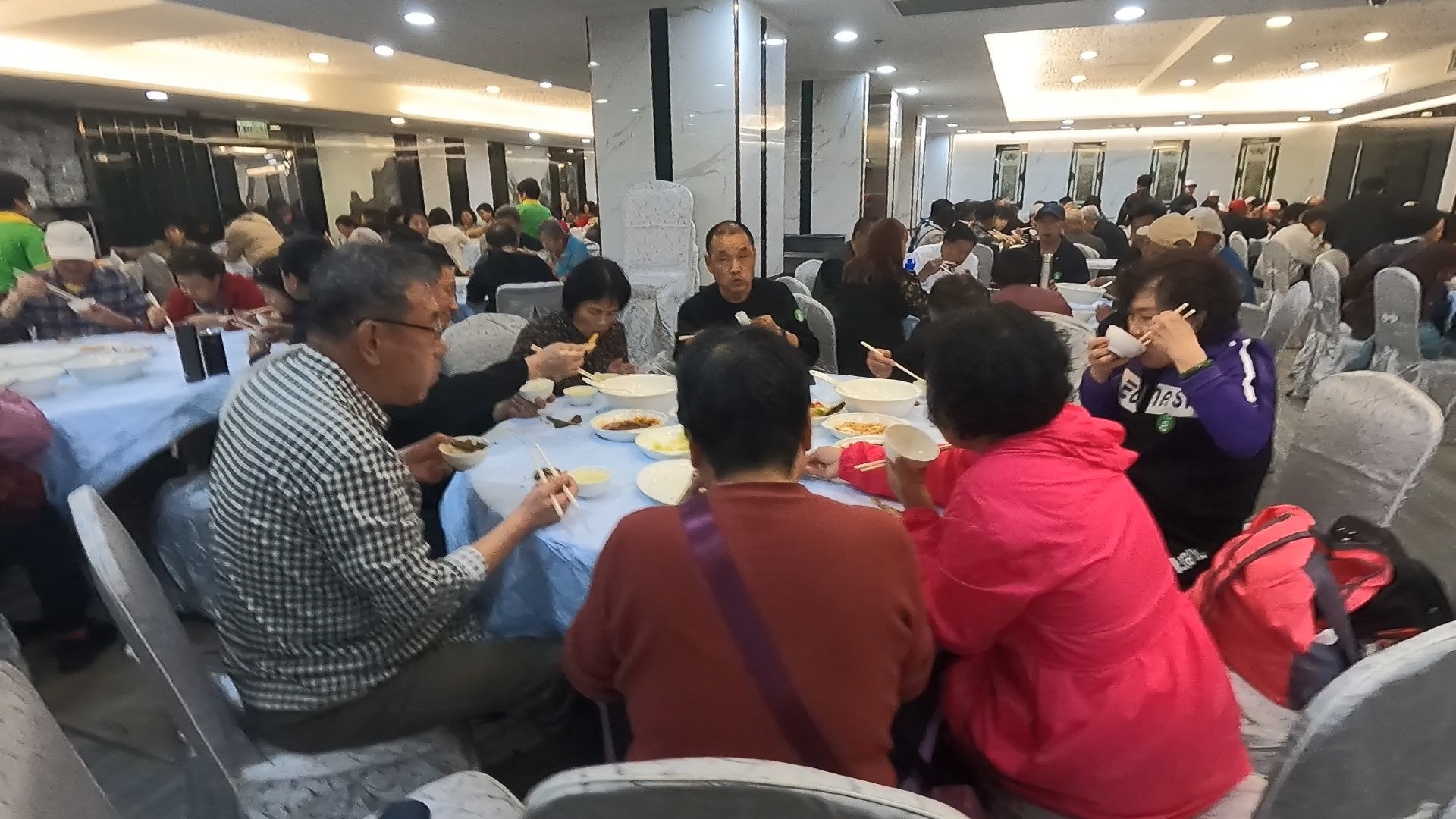 負責傳菜的酒樓女工都用餐車推着多碟餸菜出來,在人群中穿插,每當有團友入坐,酒樓女工便一次過把八餸一湯和白飯端上桌。大部分團友甫坐下便心急舉筷開餐,似乎連脫下外套、放下隨身物品的時間都沒有,不少人索性孭着背包或斜孭袋吃飯,吃得津津有味。記者看見餸菜份量似乎是僅僅足夠,有團友趕忙夾起炸魚放在碗裏,也有人站起來「飛象過河」不停夾餸。