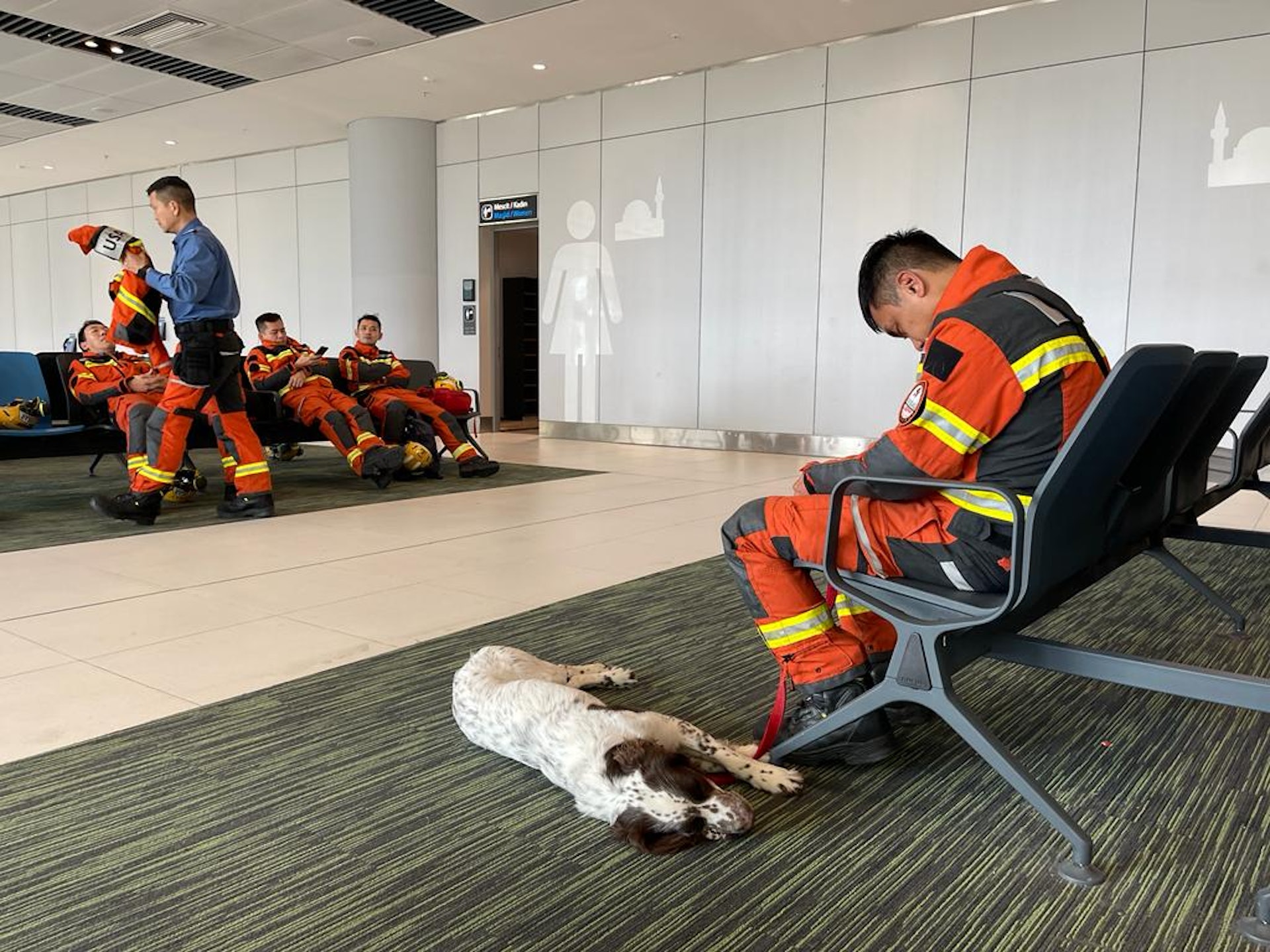 香港60人搜救隊土耳其當地時間2月9日16:00抵達土耳其伊斯坦布爾機場,轉機期間集合匯報,即將前往阿達納災區協助救援。(保安局Facebook圖片)