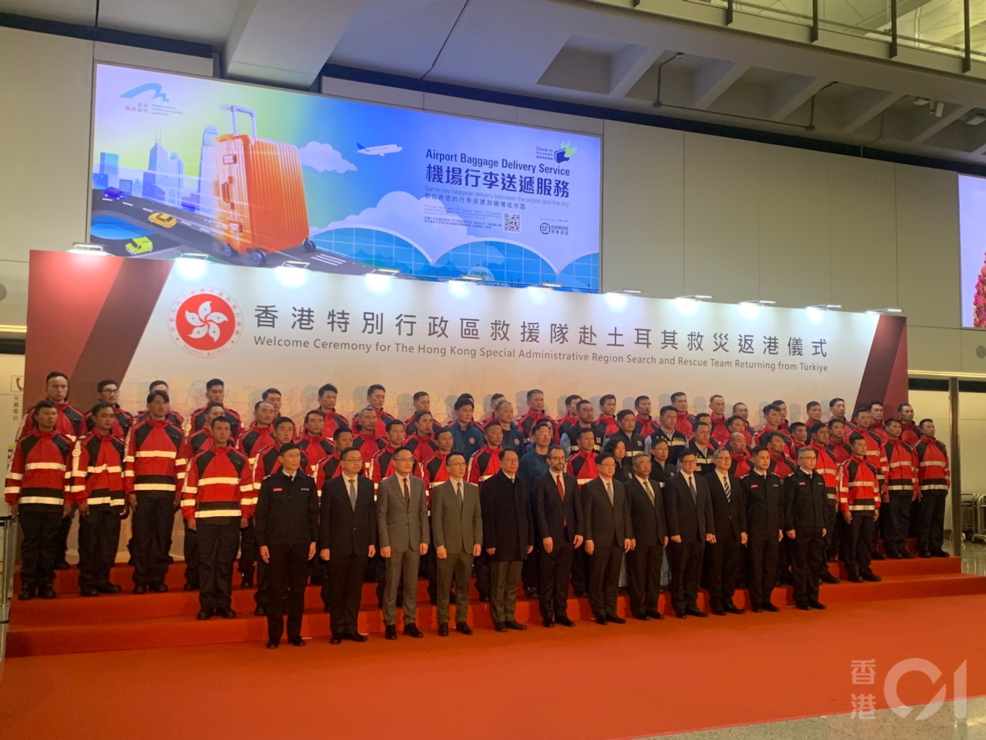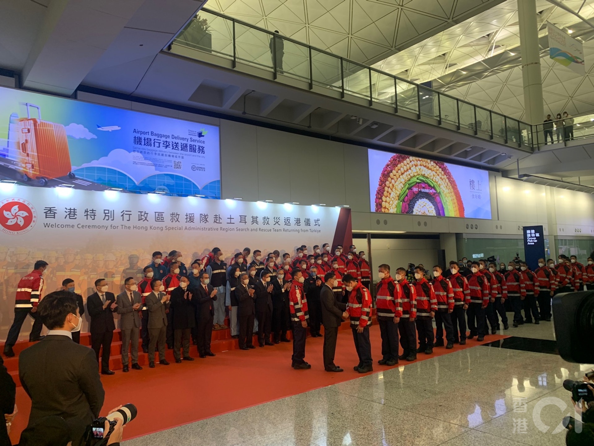 . }1 Y H3 N& n- z+ S2 C香港派往土耳其救災的救援隊2月18日凌晨步出機場。特首李家超到機場出席迎接儀式,逐一與救援隊隊員握手。(陳葆琳攝)