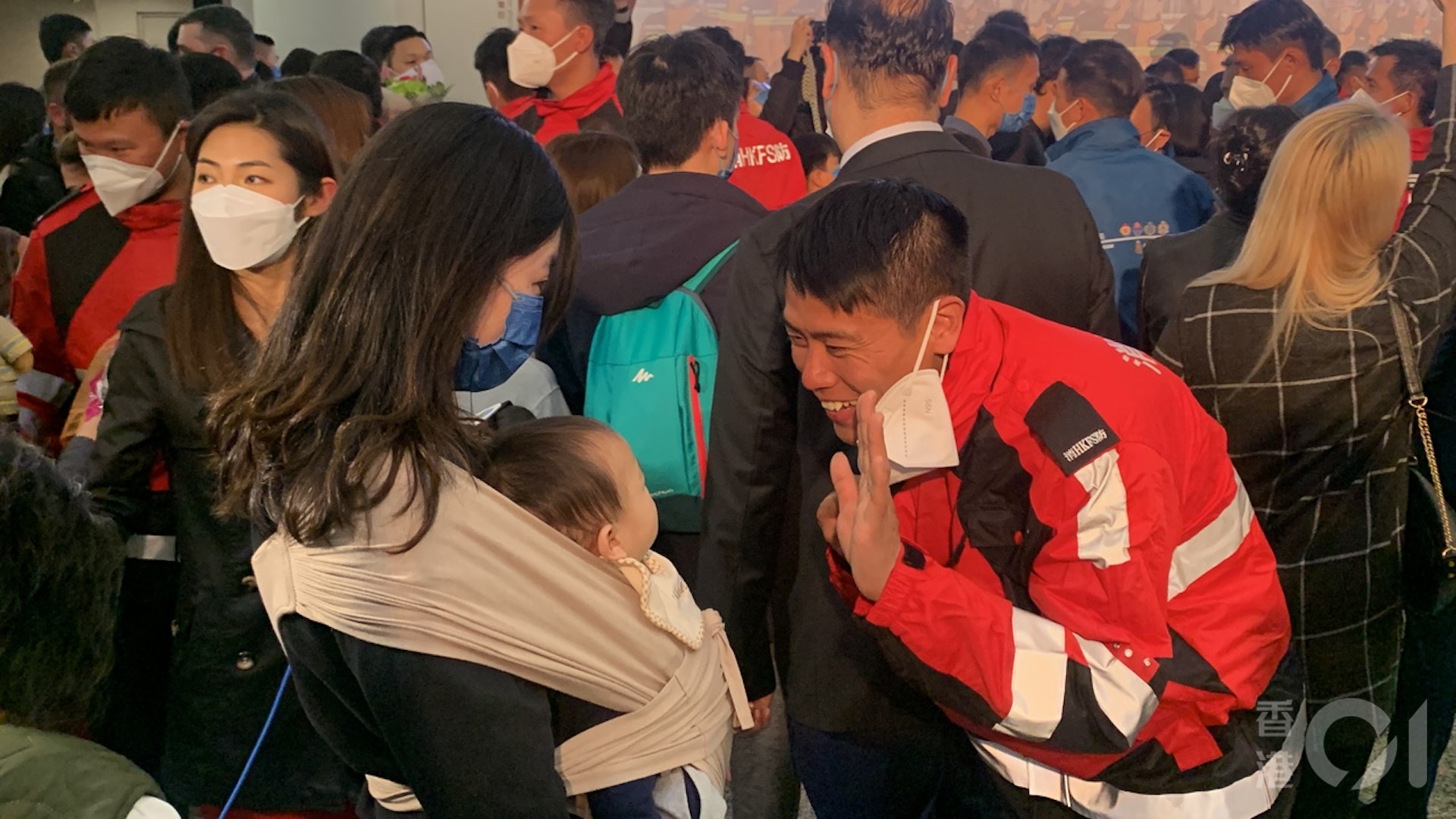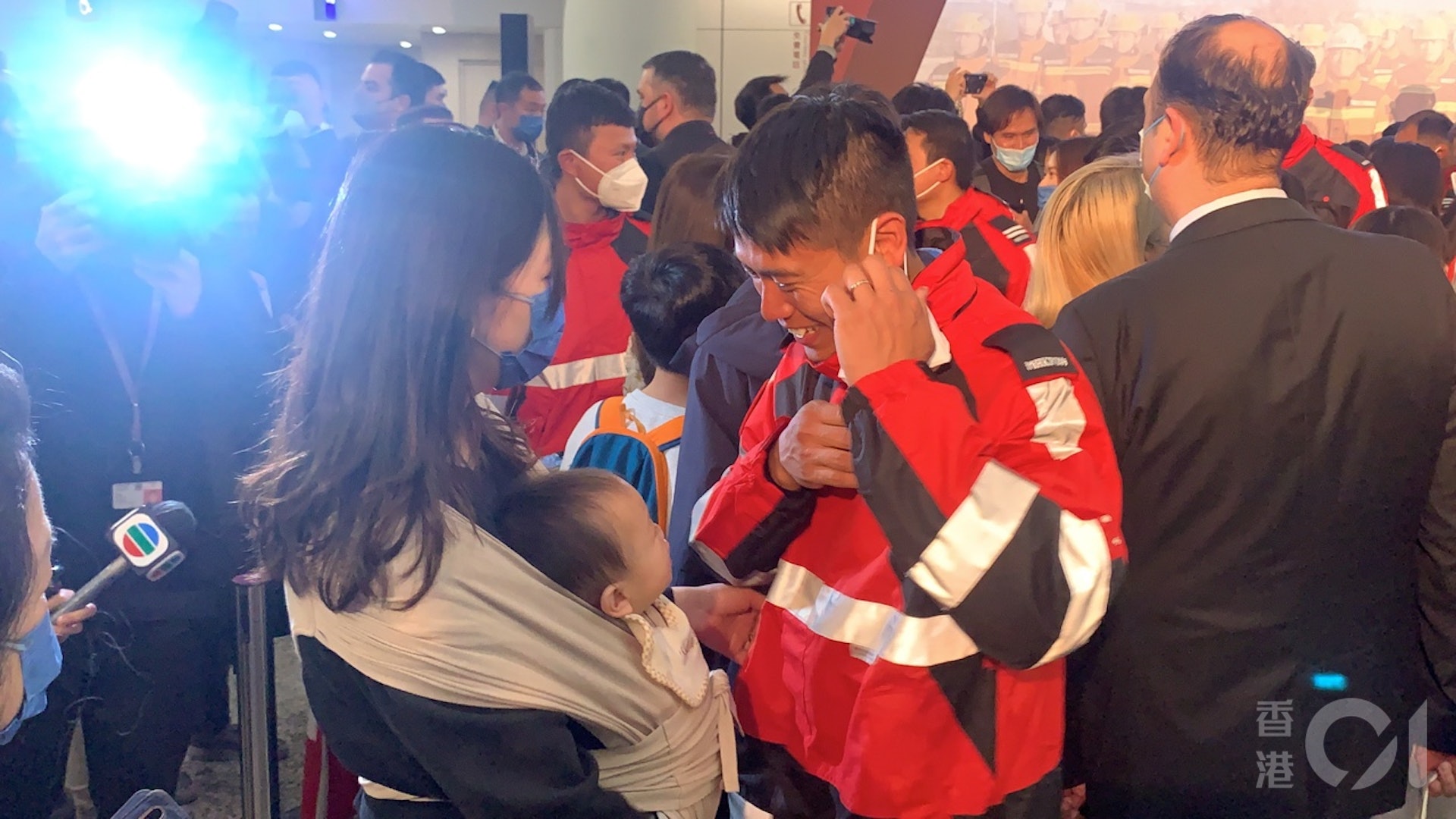 其中一名救援隊隊員文發的太太,帶同10個月大的兒子來接機,令他忍不着掉淚,並親吻了兒子的額頭。(陳葆琳攝)' `( m/ @! J0 Z$ y- G$ B; B3 c