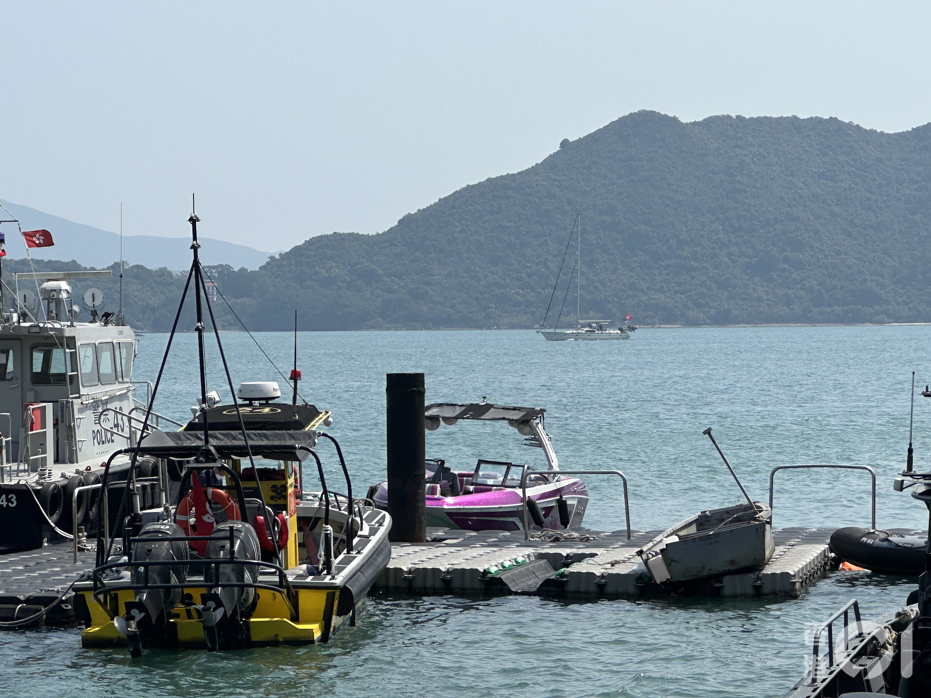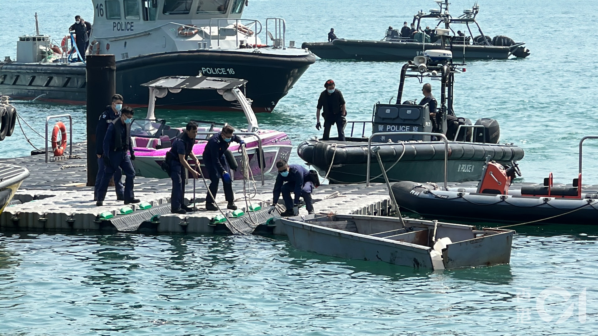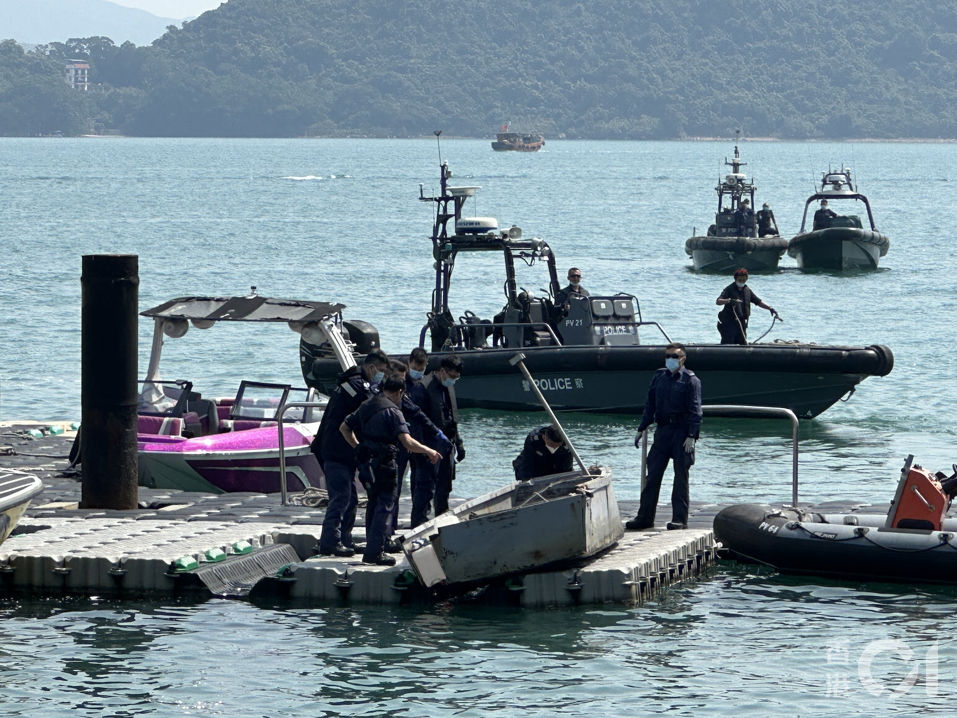 西貢對面海水警基地停泊兩艘懷疑涉案船隻,其中一艘舢舨,長約10呎,船尾位置嚴重損毀,有可見的裂痕;另外一艘懷疑涉案的快艇亦停泊在基地。警方正對兩艘船進行調查。