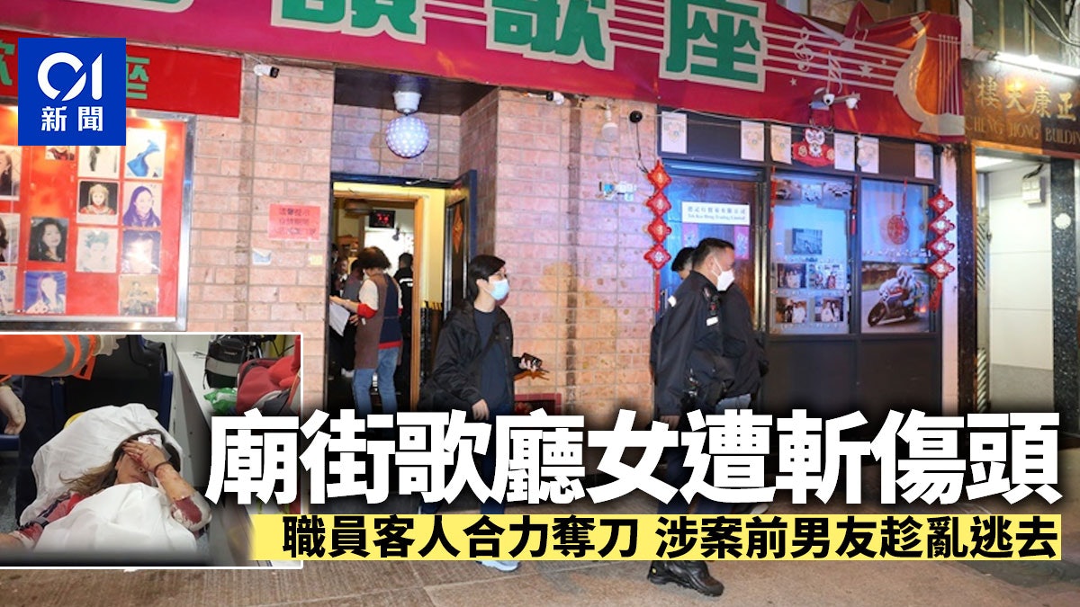 女傷者姓劉48歲,洋名Anna,與年約60歲的逞兇者是前度情侶關係。據稱,今日凌晨時分,兩人已經在歌廳內因感情問題爭執,不歡而散。至凌晨3時許,前男友折返歌廳,身後藏刀,職員發現異樣,阻止他進入,惟對方未理會強行入內,取出菜刀襲擊劉女。劉女前額、左面頰及手等多處中刀浴血。在場職員及客人合力將逞兇者制服,奪去菜刀,惟混亂間終被他甩開,往永星里方向逃去。