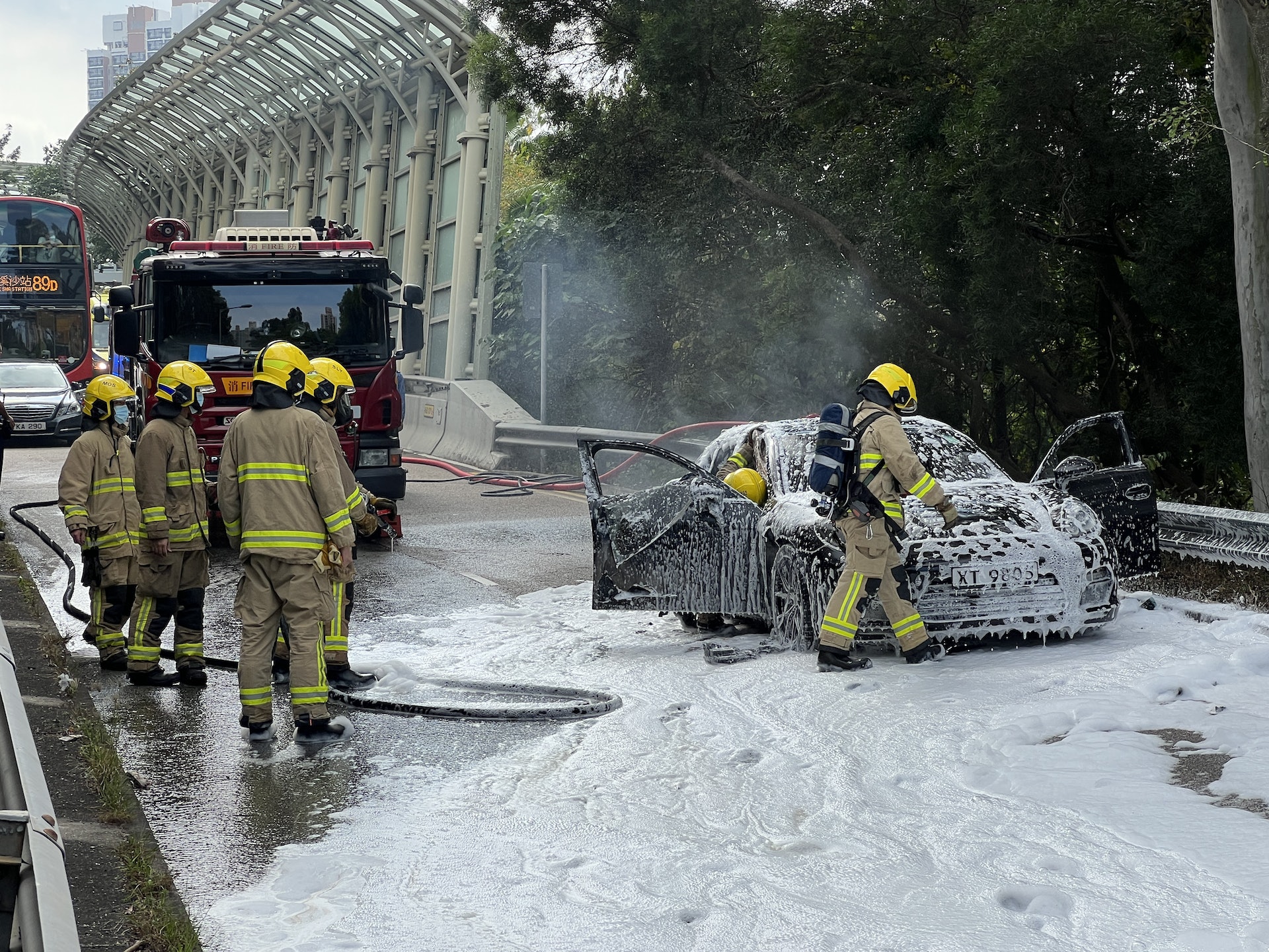 據現場圖片可見,事發時涉事私家車被熊熊烈火包圍,火勢猛烈,事發後該輛私家車外殼被焚燒至黑色,後座部份燒至溶溶爛爛。有乘搭巴士的乘客需落步行到其他位置上車。