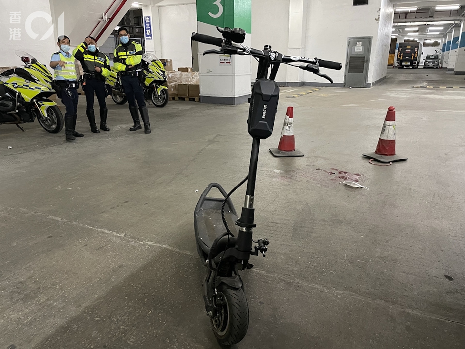 ( [% L0 |7 U/ K# Dos.tvboxnow.com涉事電動滑板車旁遺有鮮血。(陳永武攝)
