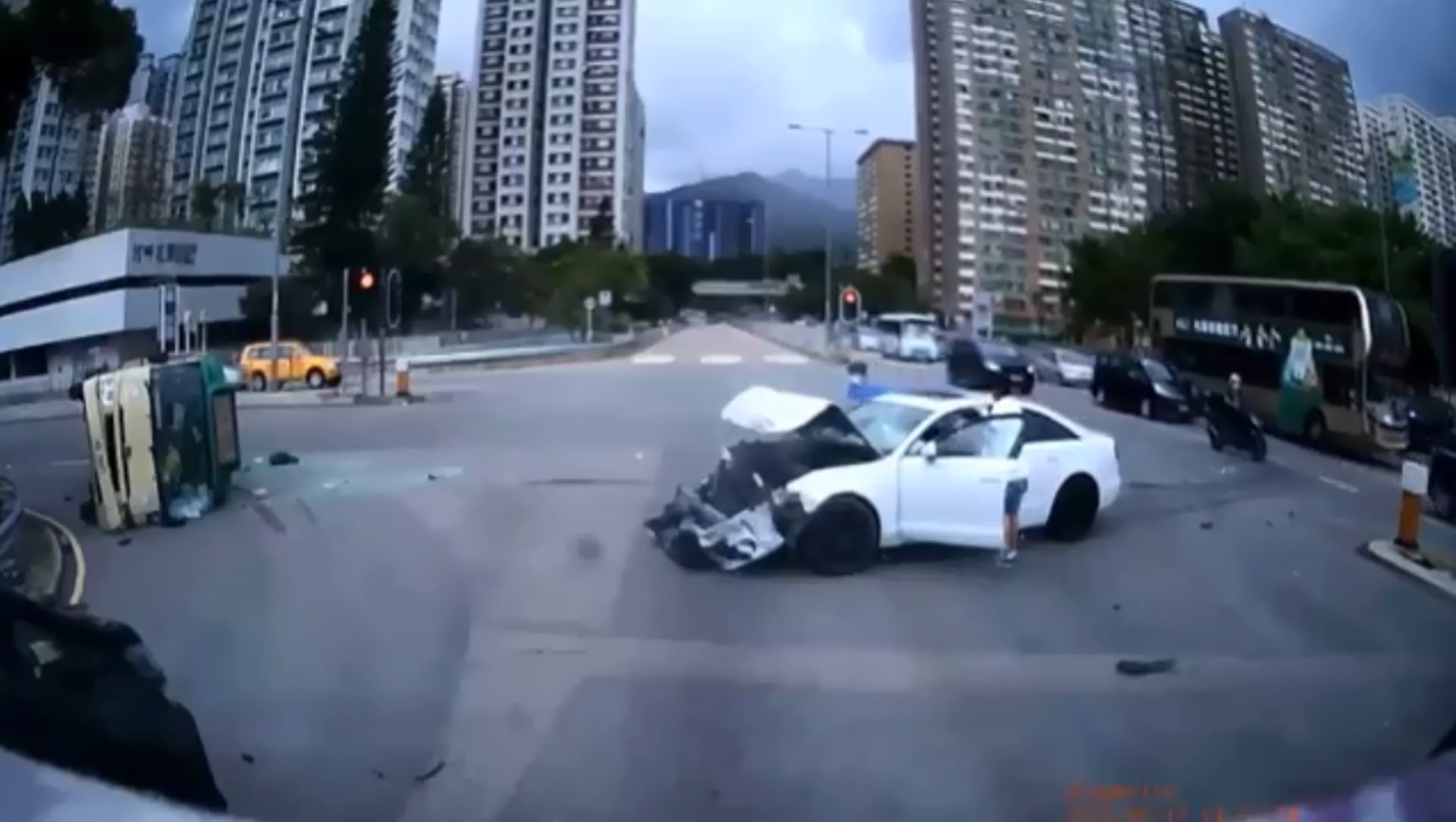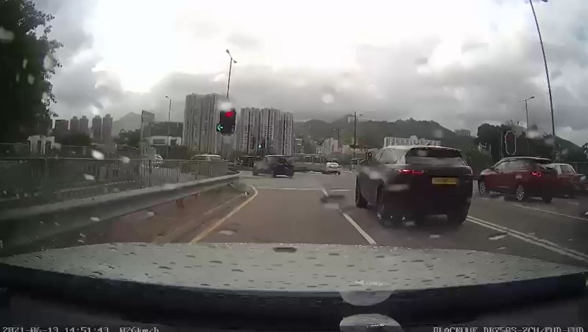 當時沙田圍路向新城市方向近大涌橋路的「孭仔燈」只有剪嘴燈為綠燈,但中線一輛黑色私家車向前直行。(網上影片截圖)