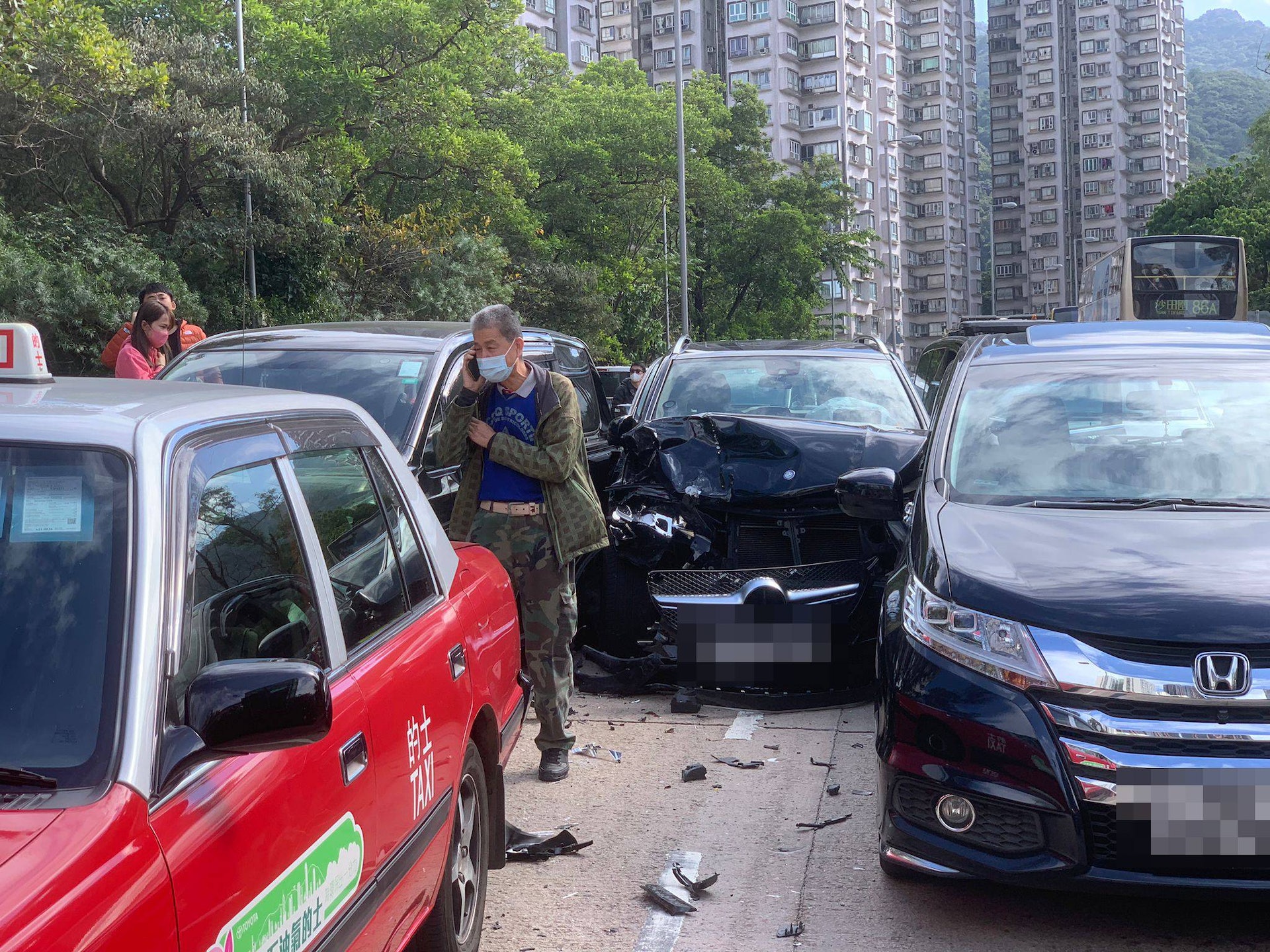 4 R) s- T+ L$ y e4 B* S1 Q公仔箱論壇意外中涉及最少6架車,包括的士和私家車;有司機在場協助調查。(讀者提供)$ x9 ]5 L5 w' a2 S8 E