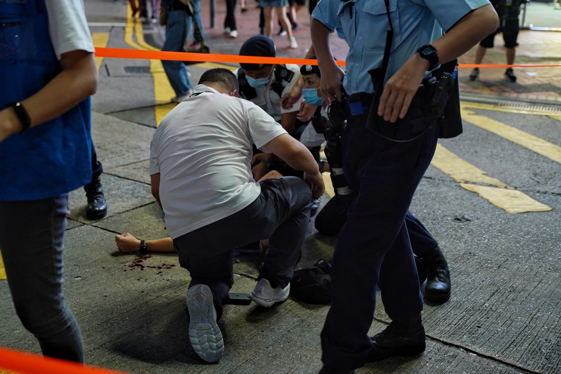 2021年7月1日晚,有人在銅鑼灣用刀刺向一名警員左背,男子梁健輝疑用刀自插胸口死亡。(資料圖片), k1 [6 ~8 s, f3 ~/ y' p