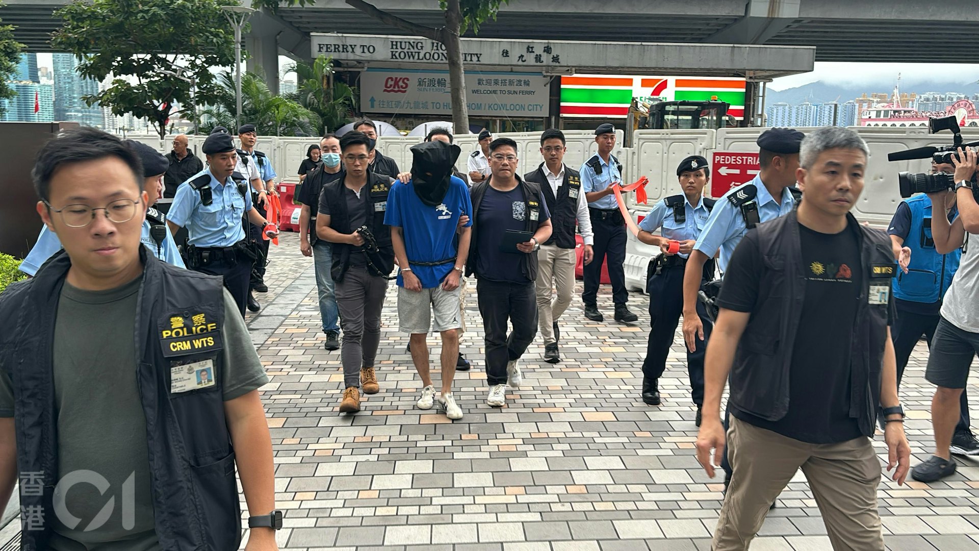 6 H5 |* ^) ^7 f4 |男疑犯戴上頭套,其雙手被鎖上手銬,腰纏鐵鏈被押解北角碼頭進行案件重組。(陳浩然攝)