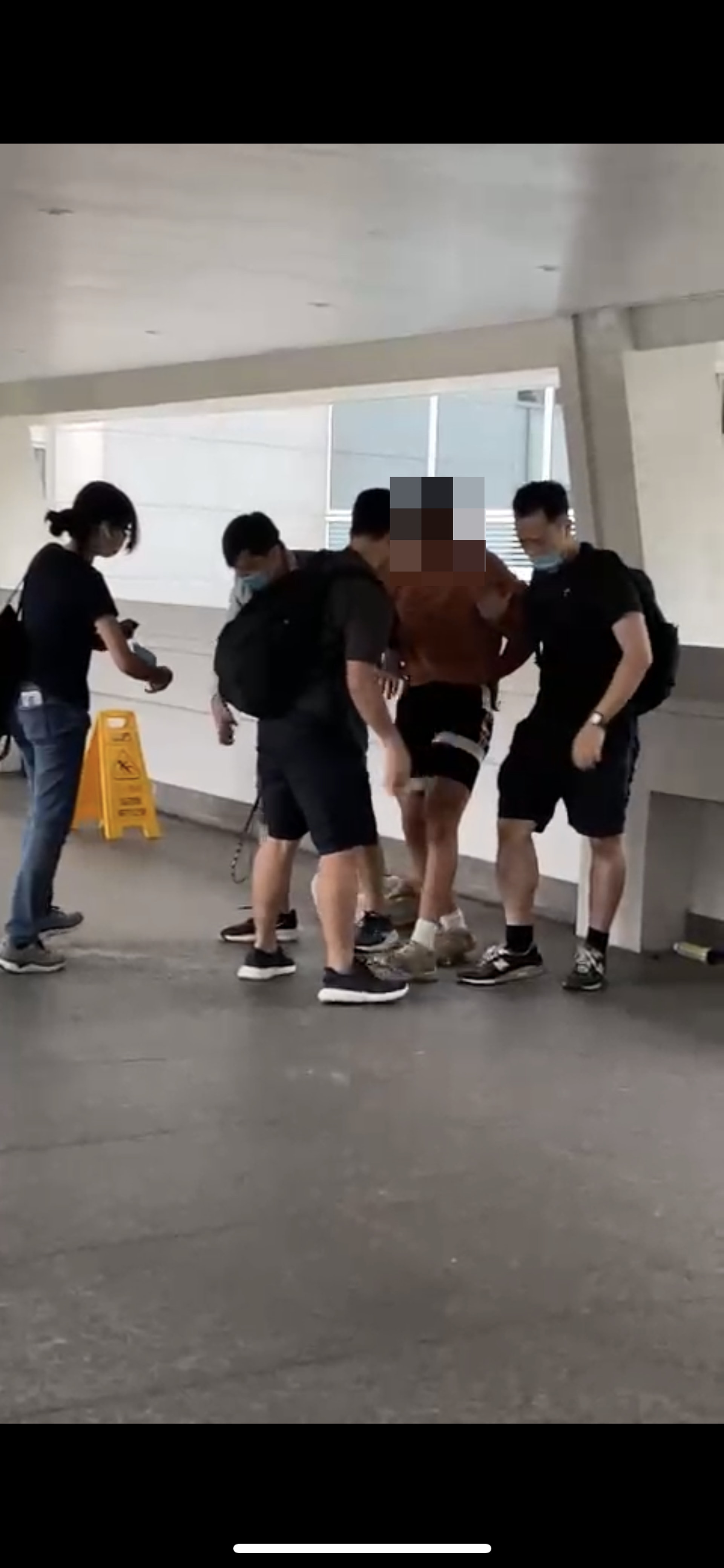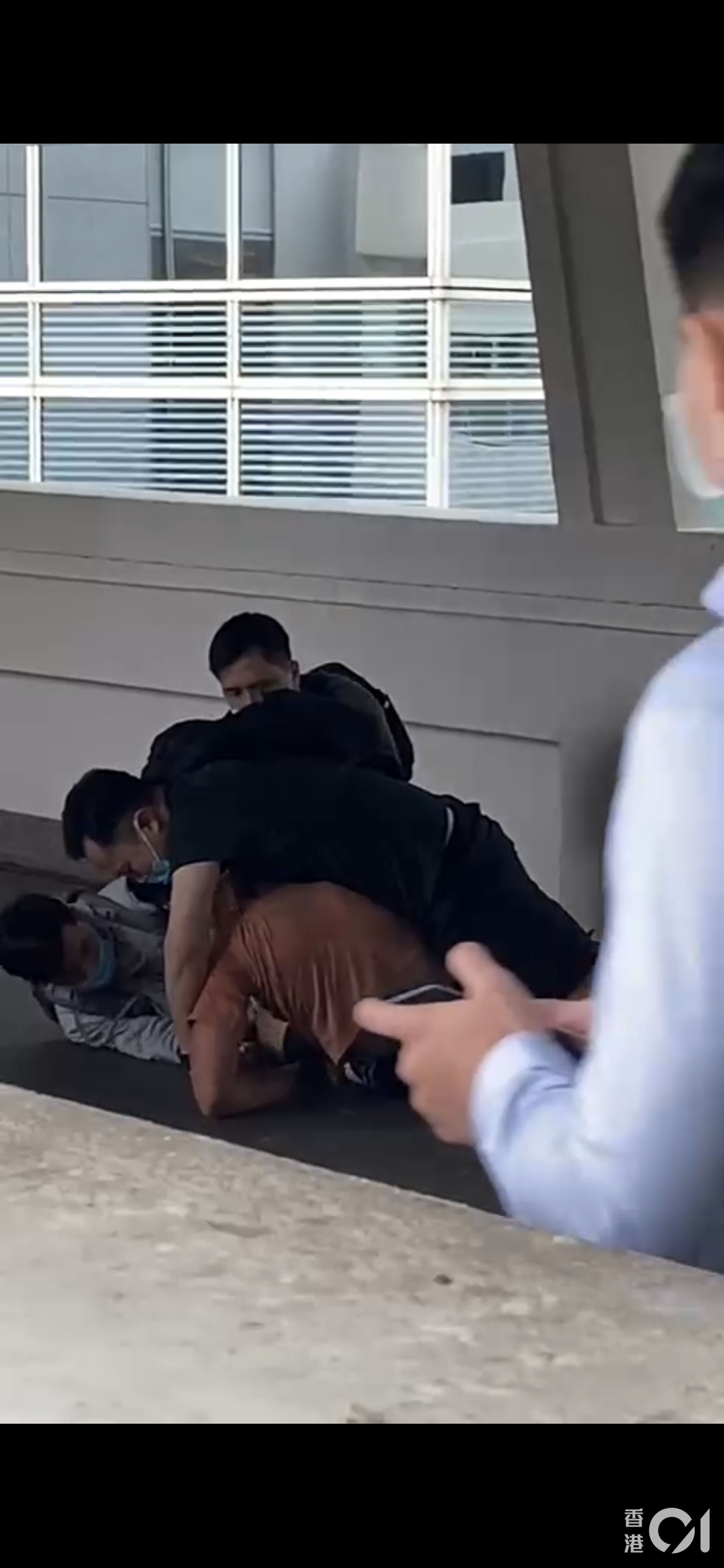 一名休班警昨日(25日)在港鐵中環站,涉嫌於扶手電梯上偷拍女乘客裙底,當場斷正,被鐵路警區特遣隊的同袍拘捕。有讀者向《香港01》提供一段拘捕片段,他透露事發約下午2時許,途經國際金融中心的行人天橋上,見到4名男子在上址扭鬥,片中所見,疑犯身材魁梧高大,身穿橙色上衣、緊身運動短褲,3名便衣男警表明身份後欲將他截停,但疑人在多人包圍下,仍極力反抗掙扎,便衣警員於是埋身肉博,最終4人扭打成一團,疑犯被撳在地上制服,期間警員不斷指令「手擺後面,唔好郁!」,其後再多一男一女便衣警員到場協助,疑犯終被反手鎖上手扣押走,整個過程歷時約2分鐘,由於剛過午膳時間,大批途人駐足圍觀。