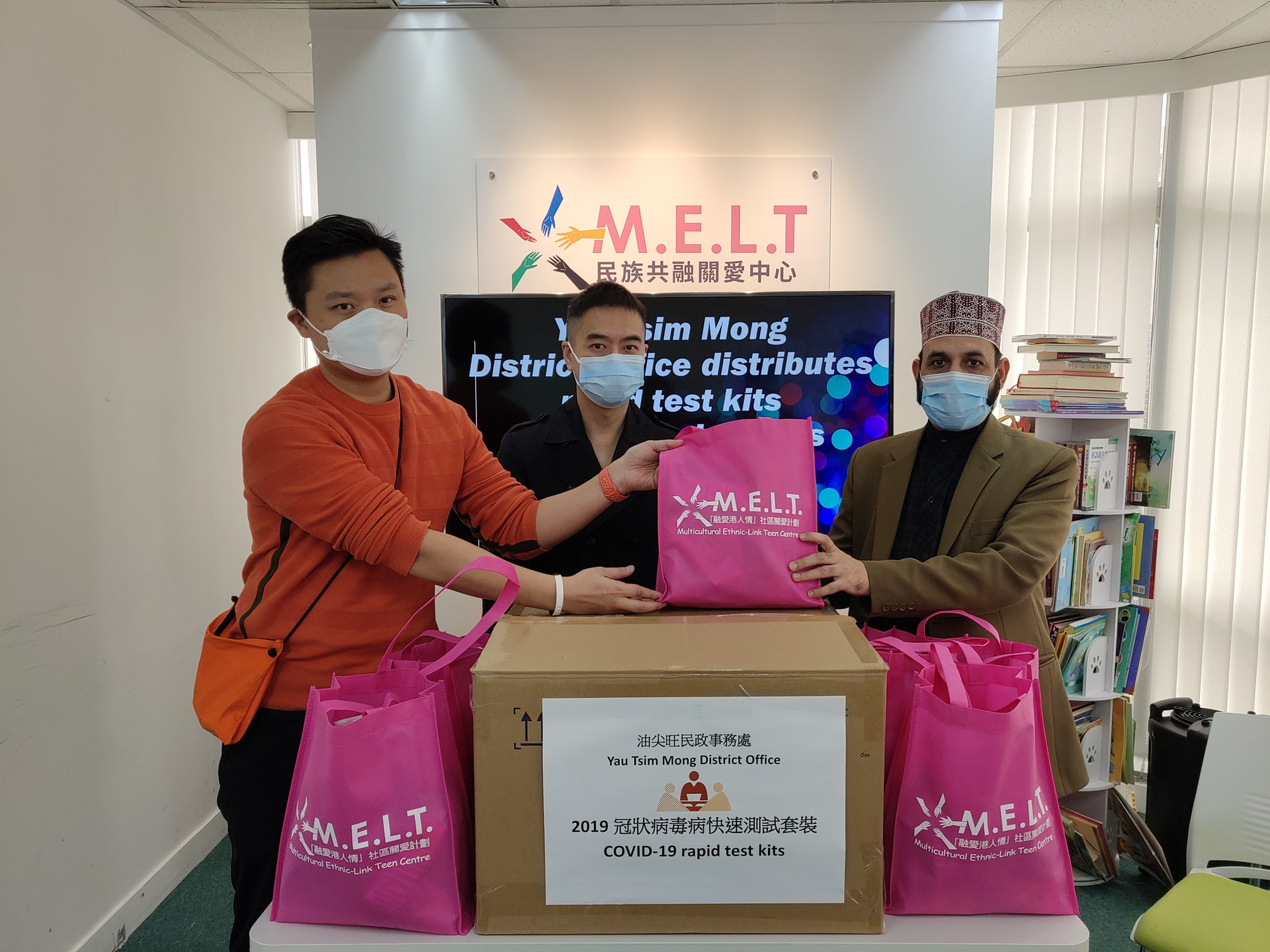 D% Q; O; O/ f0 u2 F油尖旺民政事務專員余健強(中)、立法會議員鄭泳舜(左),向油尖旺區內巴基斯坦組織代表送上快速測試套裝。(民政事務總署)