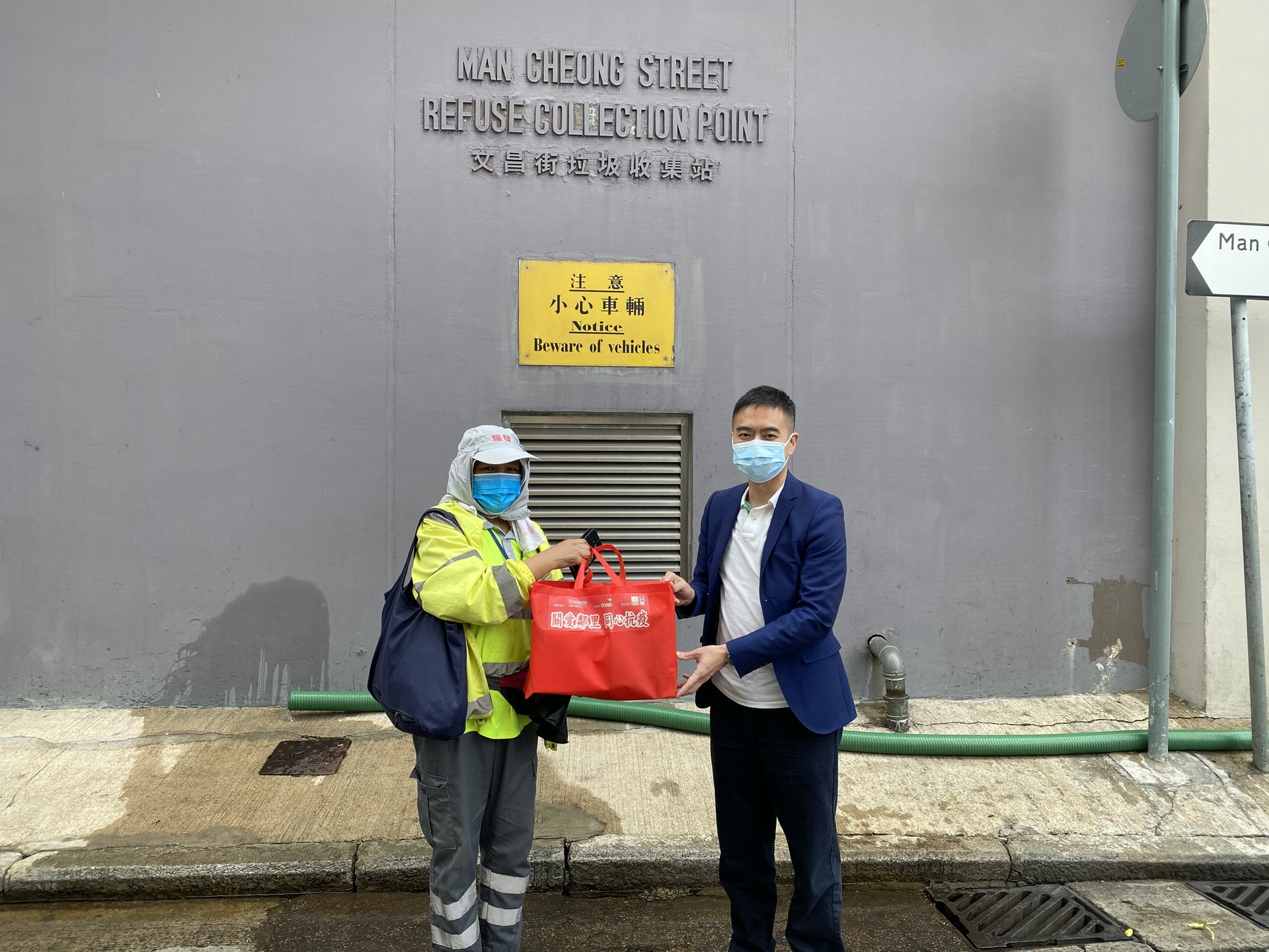 % g. _, a8 {2 }tvb now,tvbnow,bttvb油尖旺民政事務專員余健強(右)向文昌街垃圾收集站的少數族裔清潔工人派發物資。(民政事務總署)