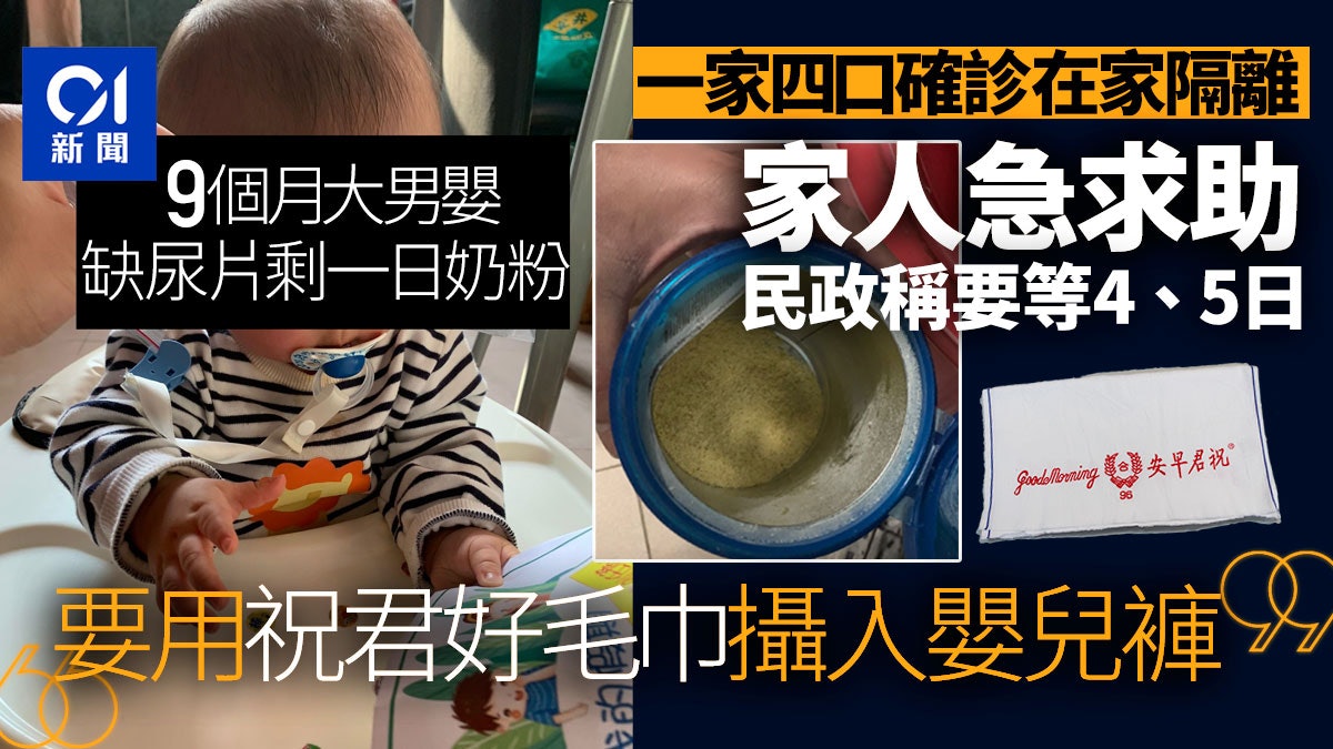 新冠肺炎疫情嚴峻,不少輕症患者在家隔離。廖生一家六口周一(14日)有四人確診須隔離,包括一名9個月大的男嬰。他表示,家中沒有合適嬰兒服用的藥物,奶粉亦只剩下一日份量,尿片更已經用畢,「現在只是用祝君好毛巾放入嬰兒褲。」