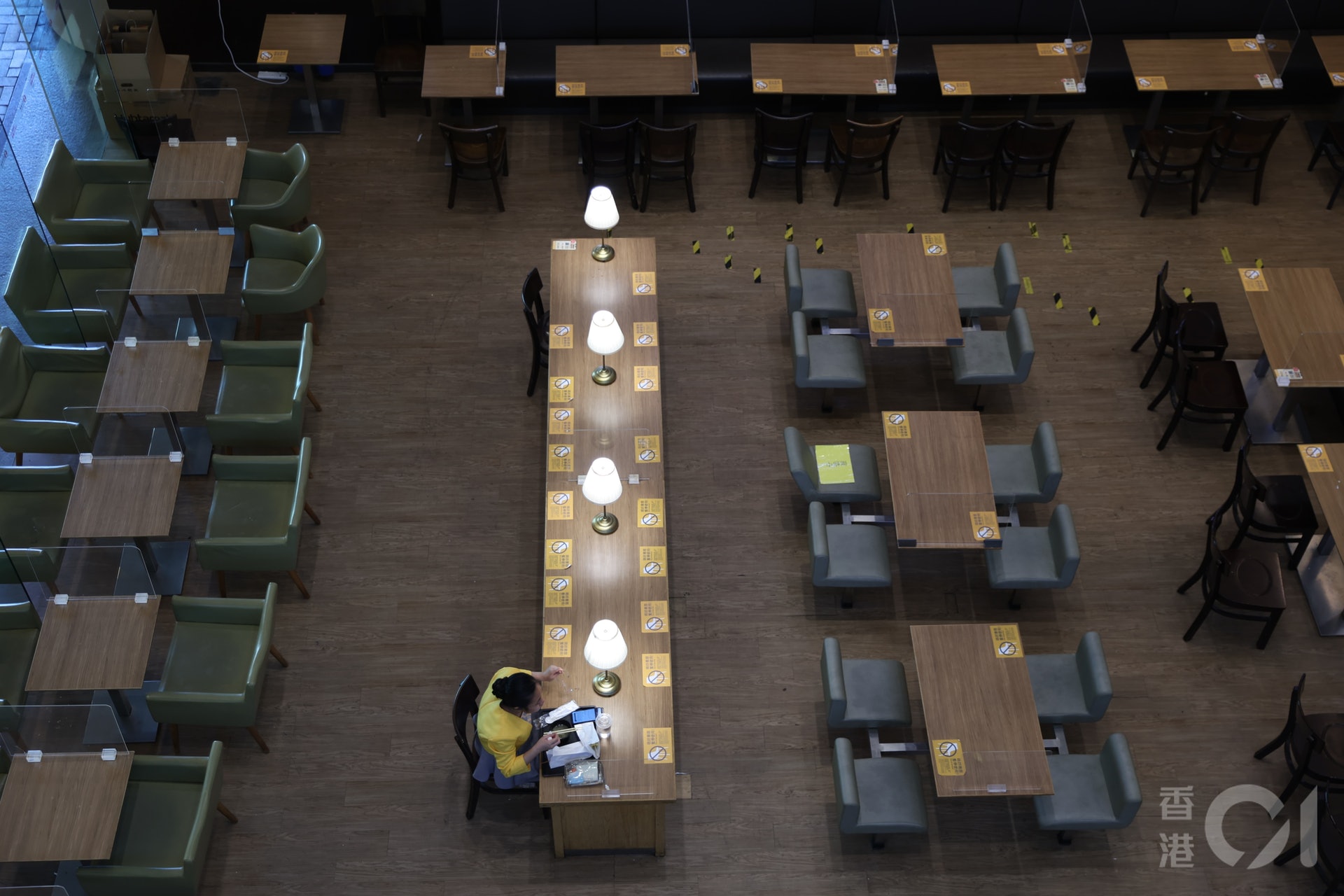 0 q. ~, g+ b+ |! I6 v8 N5 \第五波疫情持續兩個半月仍嚴峻,食肆堂食限最多二人一枱,3月15日所見,午餐時段有食肆只有廖廖數名食客。(鄭子峰攝)
