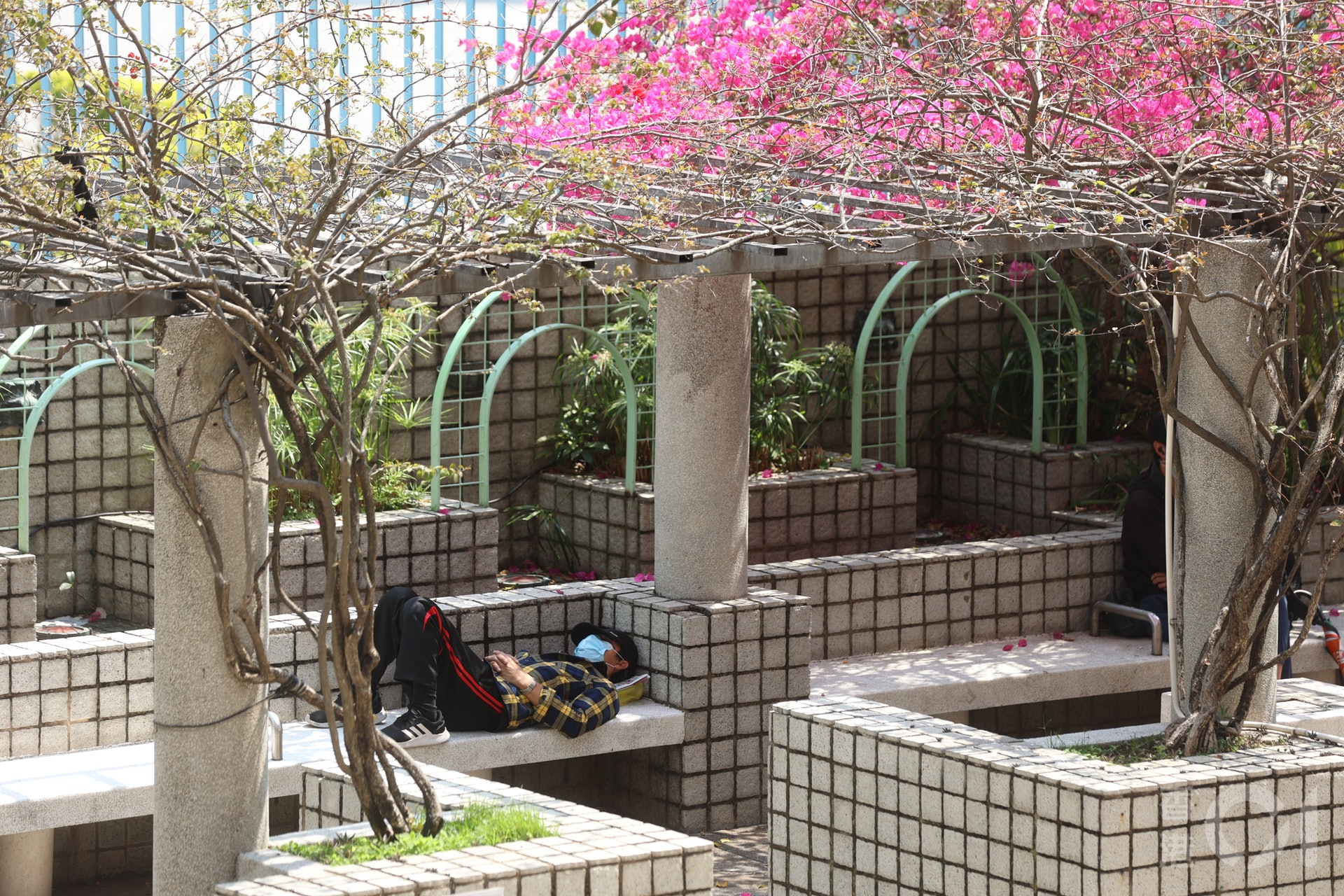 3 W: @9 m8 M9 |% ]! h公仔箱論壇第五波疫情持續兩個半月仍嚴峻,市民減少外出,3月15日的公園一角,有市民一人享受春日陽光。(鄭子峰攝)