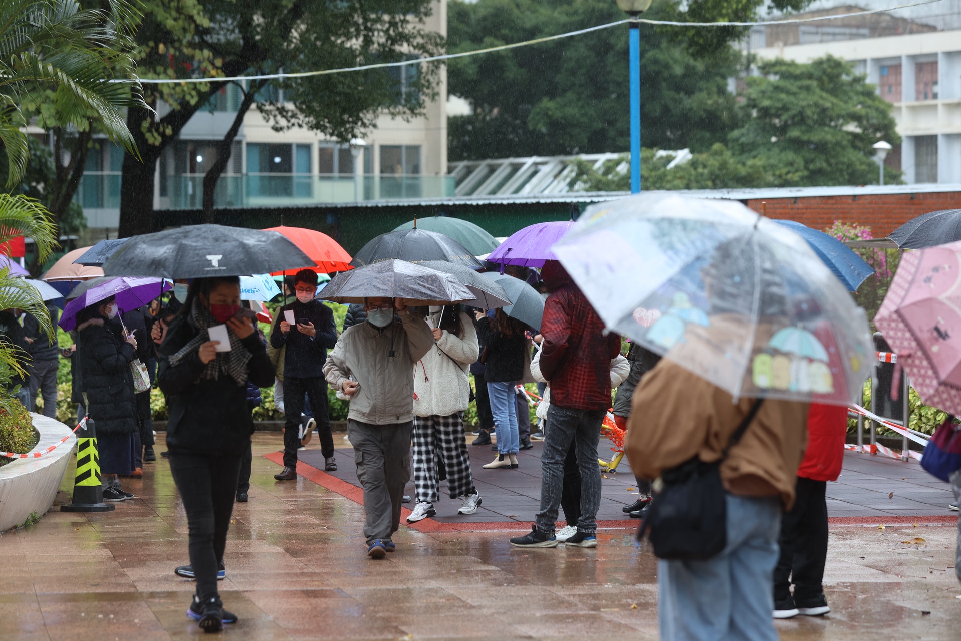 8 X0 Y3 r" {" L5 M2月21日天氣嚴寒,雨勢有時較為頻密,在荃灣沙咀道遊樂場球場的檢測站,有不少市民冒雨外出檢測。(鄭子峰攝)